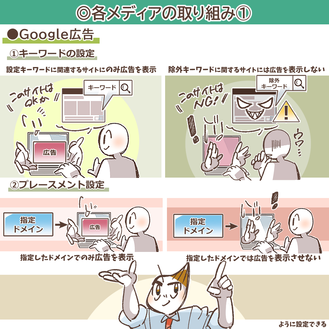 Google広告では、長年にわたり広告掲載ポリシーの厳格化と審査体制の強化を通じて、プラットフォームの健全性維持に努めています。広告主が能動的に活用できる代表的な機能が「キーワード設定」と「プレースメント設定」です。
