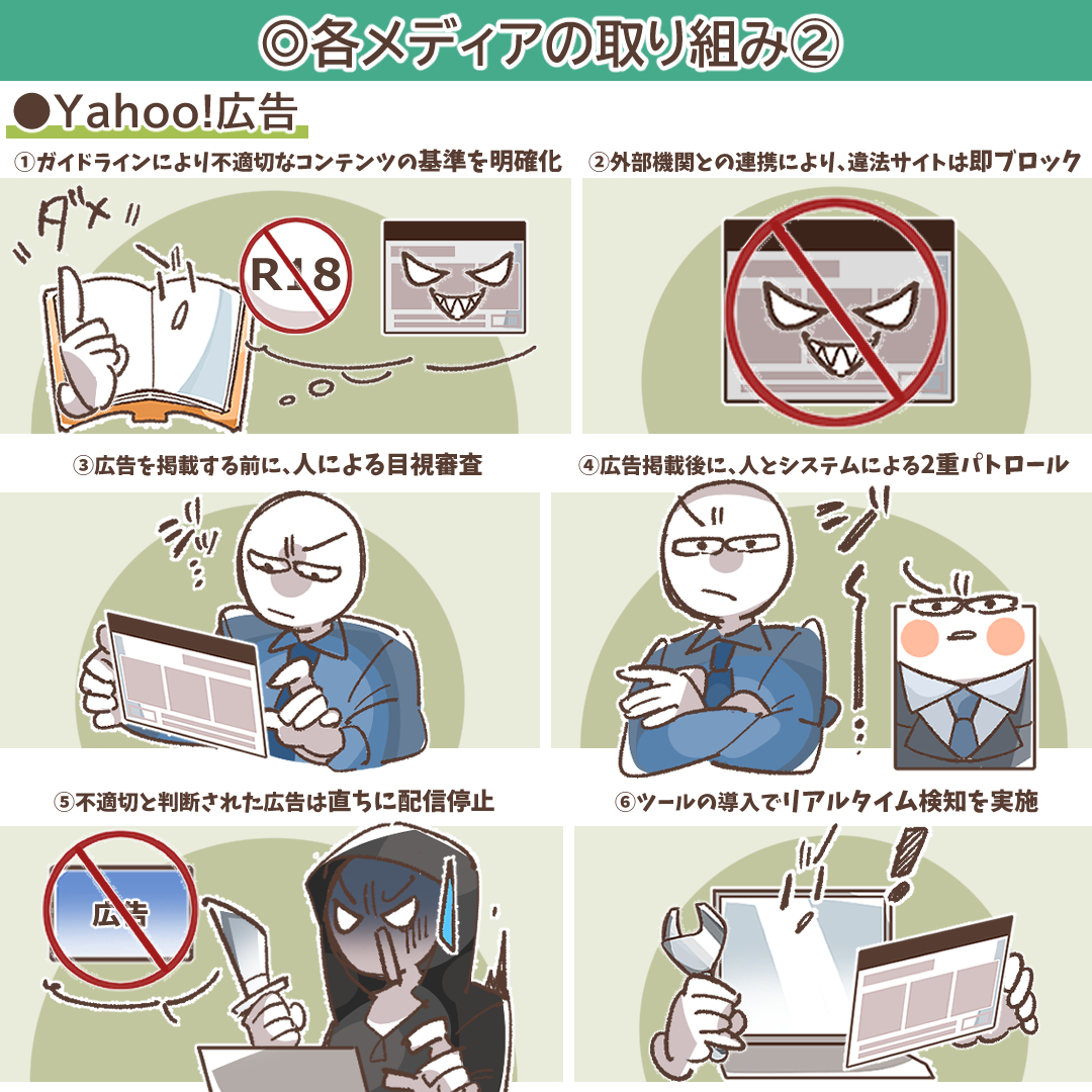 - 人とシステムの二重チェック:広告掲載前の目視審査に加え、掲載後もシステムと人の両方で常にパトロールを実施し、問題のある広告や掲載面を迅速に排除する体制を構築しています。