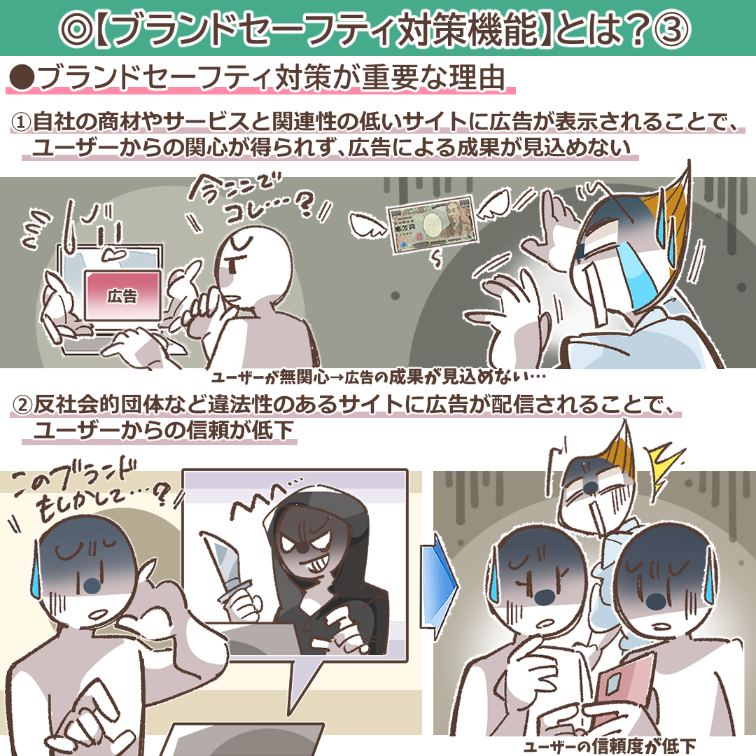 先ほどの例えをもう一度考えてみましょう。「高品質な花の種」を販売するECサイトの広告が、「強力な効果を謳う除草剤」のレビュー記事の隣に表示されたらどうでしょうか。どちらの製品もそれ自体は有益で何ら問題はありません。しかし、花の育成を趣旨とするユーザーにとって、除草剤の広告はネガティブな印象を与えかねず、広告主である種苗会社への信頼感を損なう可能性があります。その結果、本来であれば獲得できたはずの顧客を逃すことに繋がります。