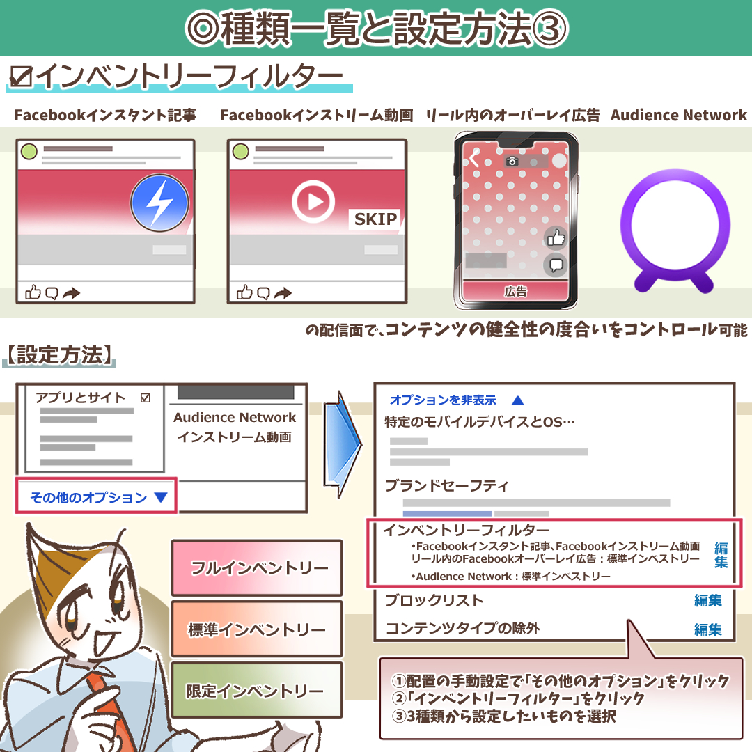 - 拡張インベントリー:収益化に関するMeta社のポリシーに違反する一部のコンテンツを除き、最大限のリーチを目指します。リーチは最大化されますが、ブランドセーフティ上のリスクも最も高くなります。