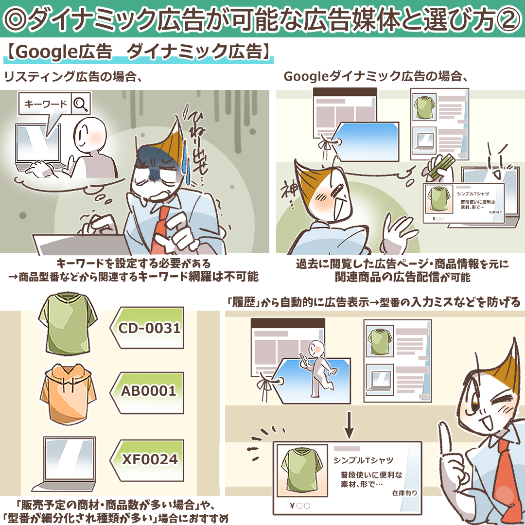 ダイナミック広告は「販売を予定している商材・商品数が多い場合」や、「商品型番が細分化されていて種類が多い」場合などにおすすめします。