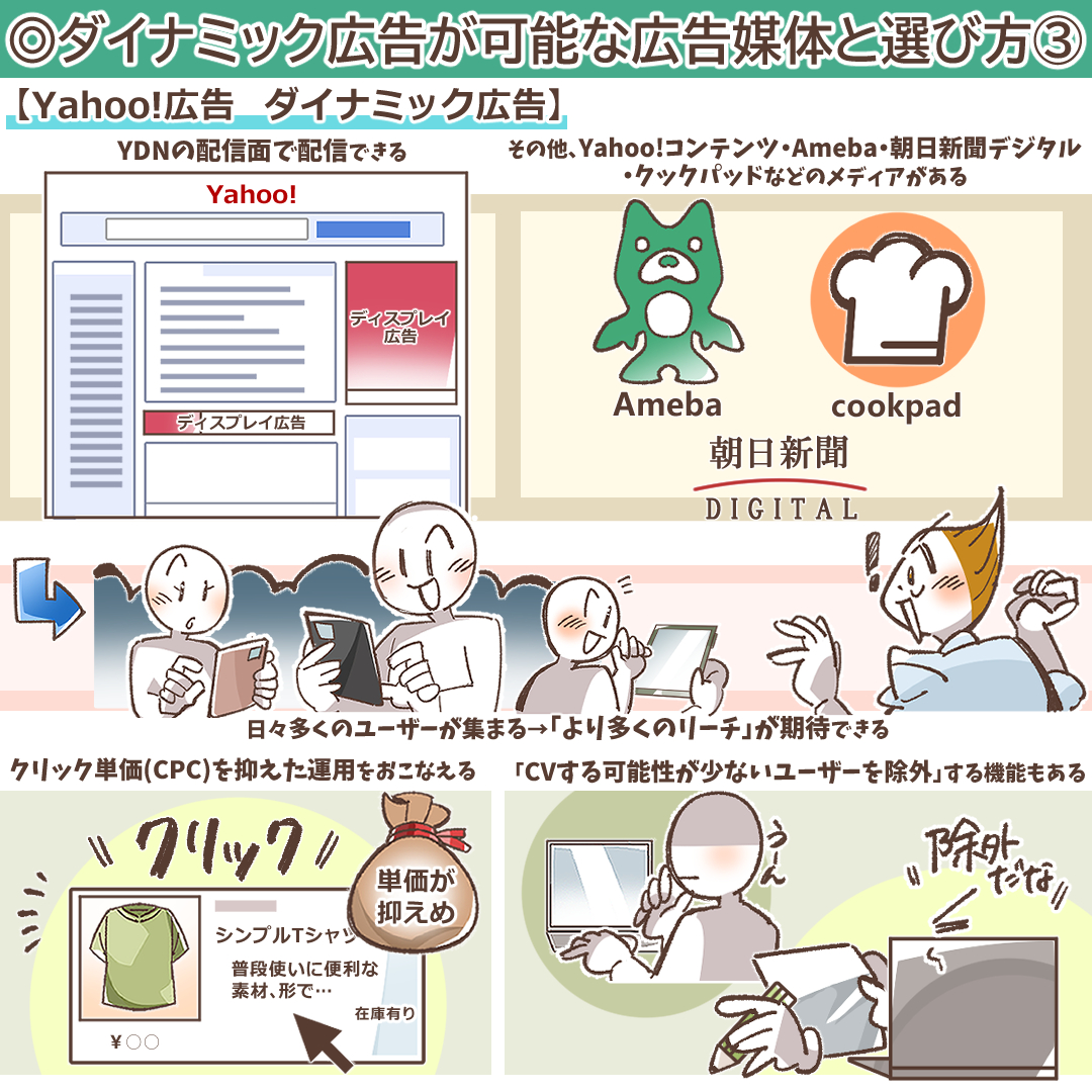Yahoo!広告のダイナミック広告は、YDNの配信面で配信できますが、ダイナミック広告のほかにもYahoo!コンテンツ・Ameba・朝日新聞デジタル・クックパッドなどのメディアがあり、日々多くのユーザーが集まるので「より多くのリーチ」が期待できるでしょう。