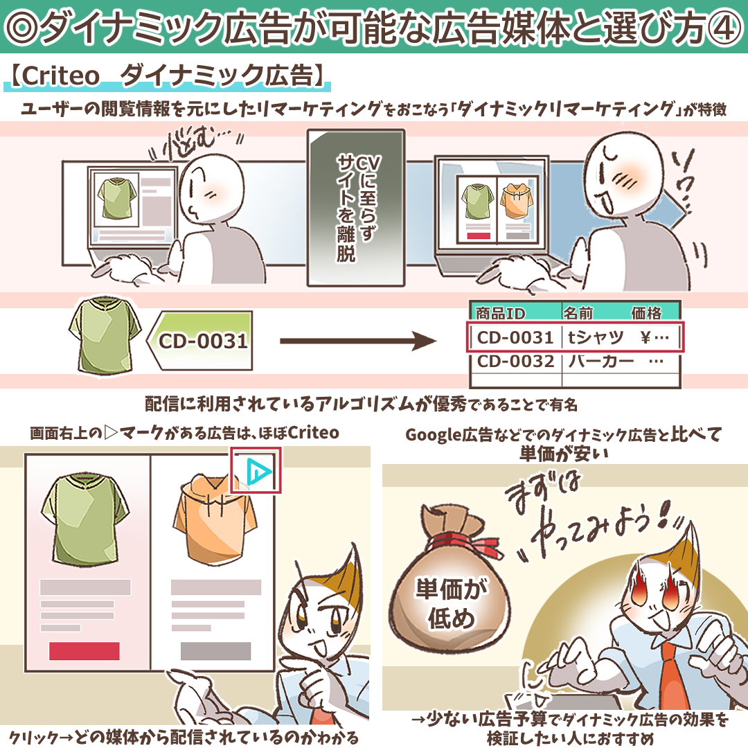Criteoは、「配信に利用されているアルゴリズムが優秀である」ことで有名です。Google広告やYahoo!広告でのダイナミック広告と比べて単価が安いので、少ない広告予算でダイナミック広告の効果を検証してみたいという人におすすめします。