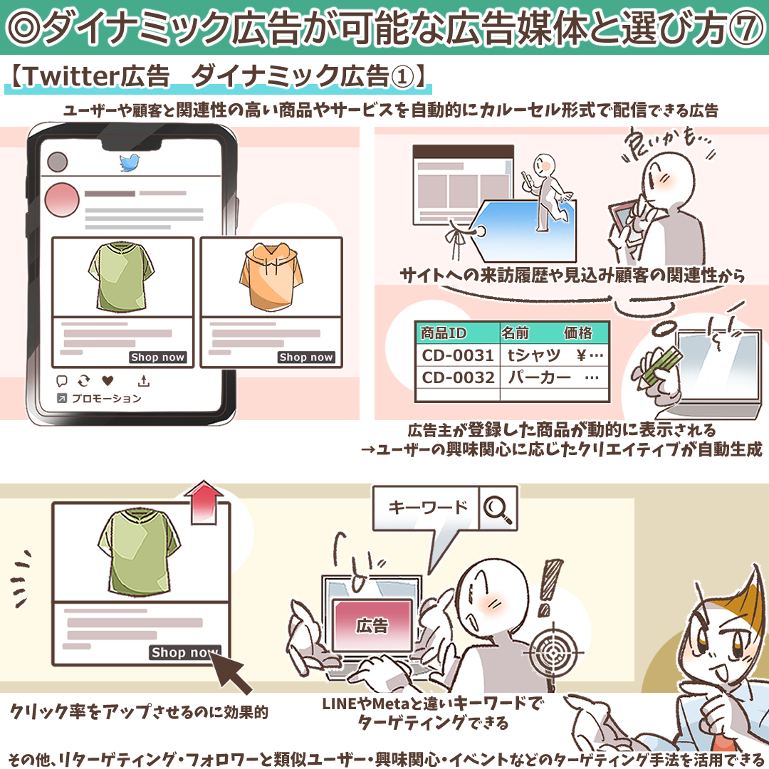 Twitter広告のダイナミック広告は、Twitter広告のフォーマットのひとつで、広告主が登録した商品データから自動的に広告クリエイティブがダイナミック(動的)に変化しながら配信される広告になります。
