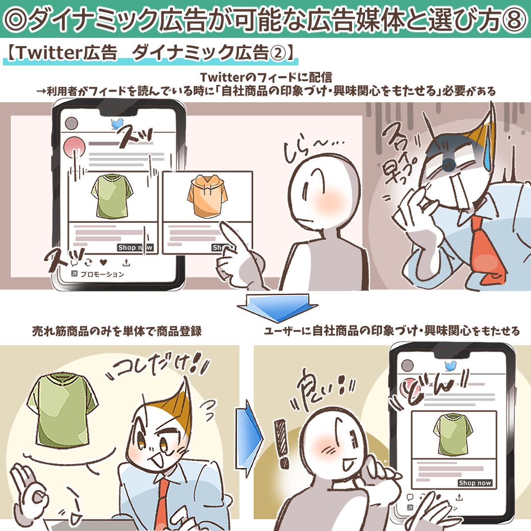 Twitterのダイナミック広告は、Twitterのフィードに配信されます。したがって、Twitterの利用者がフィードを読んでいる時に「自社商品の印象づけ・興味関心をもたせる」必要があるので、売れ筋商品のみを単体で商品登録して配信するという手法がおすすめになります。