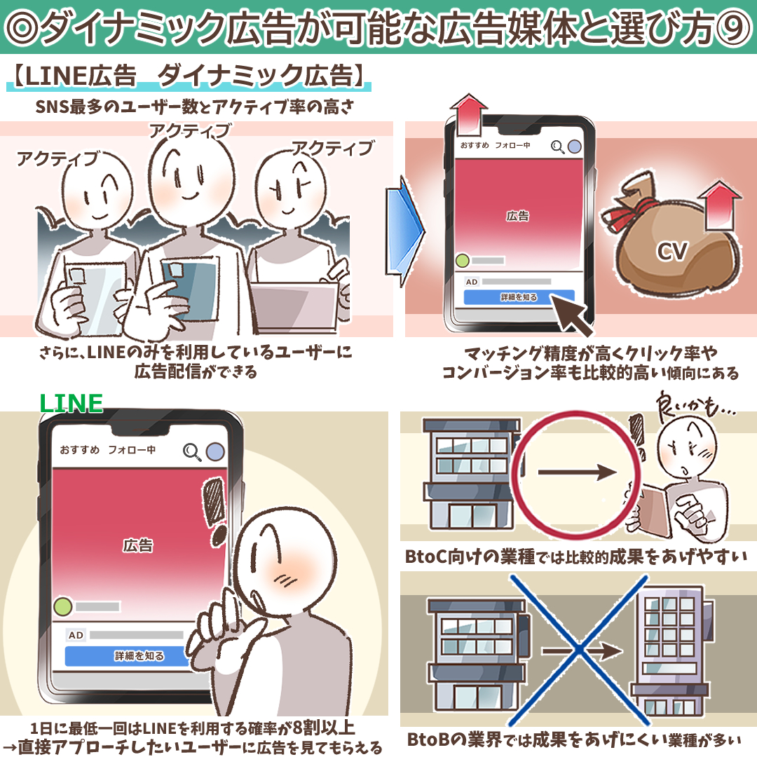 基本的にLINEは「プライベートで利用される」ことが多いため、BtoC向けの業種では比較的成果をあげやすく、LINEのダイナミック広告との相性もいいのですが、BtoBの業界では成果をあげにくい業種が多いことは覚えておいてください。