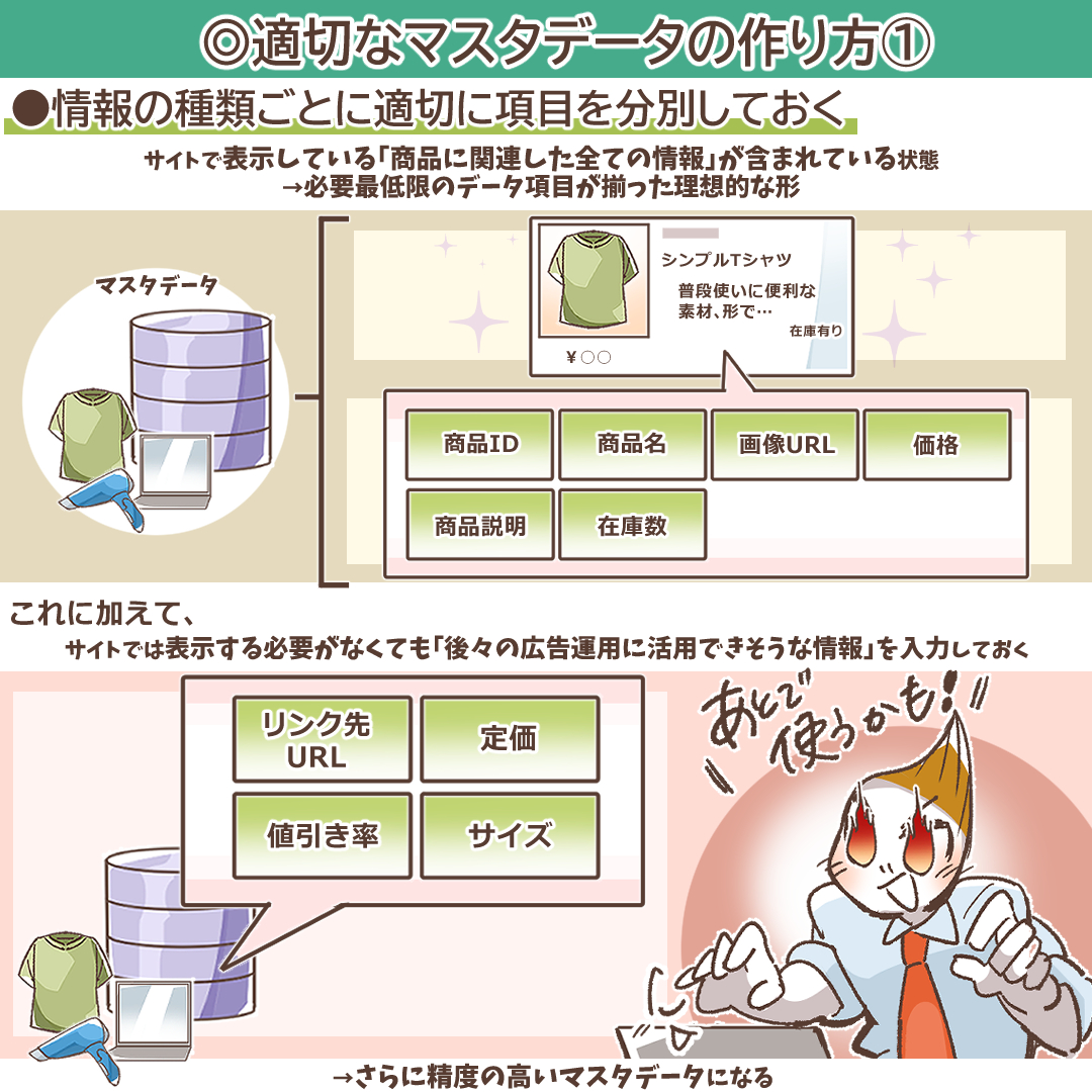 データフィードには、広告を配信する各媒体によって特性やルールがあります。マスタデータに含まれるデータが「整理整頓されている情報漏れのないデータ」であれば、データフィード作成の自由度が格段にあがります。