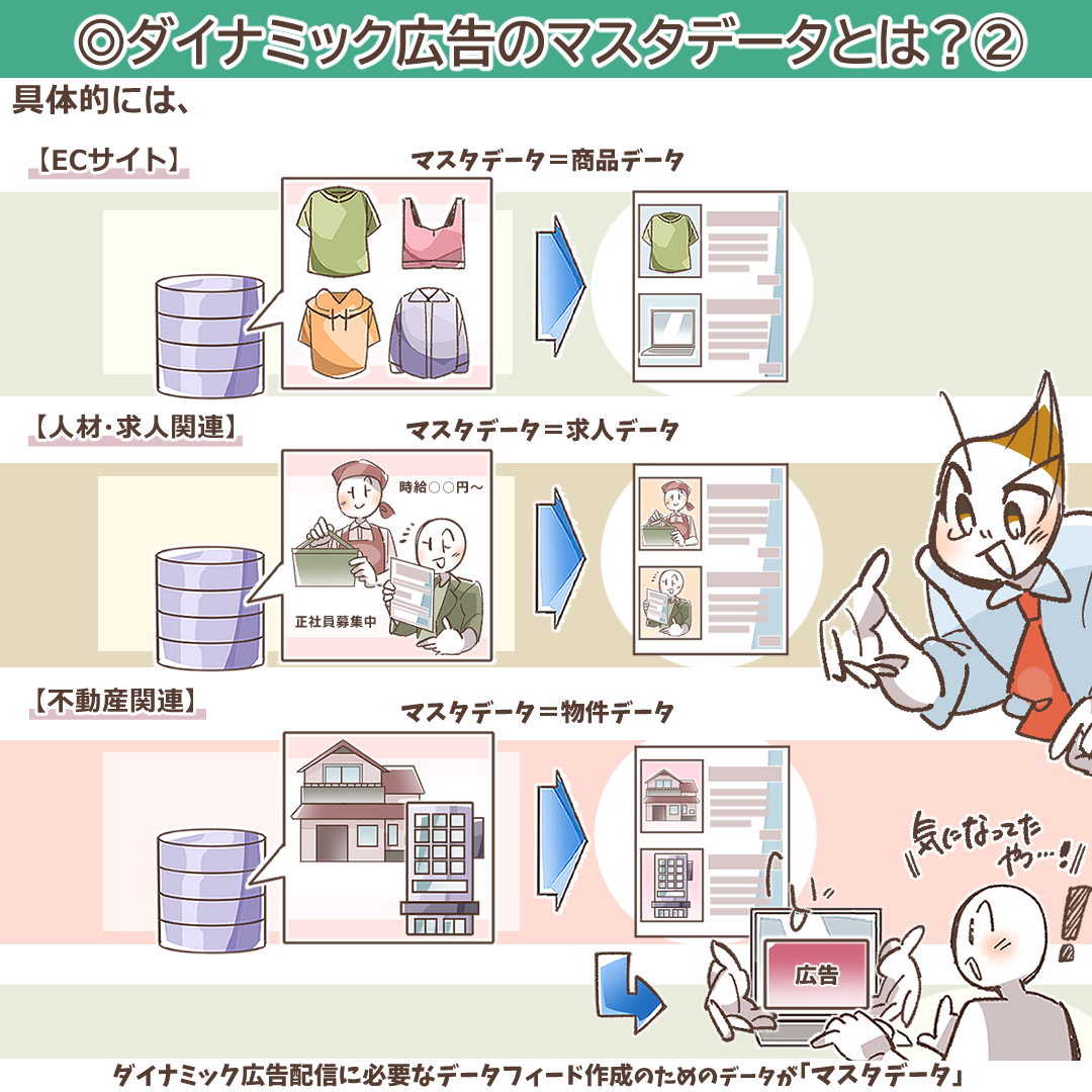 ECサイトなら「商品データ」、人材・求人関連なら「求人データ」、不動産関連なら「物件データ」など、ダイナミック広告配信に必要なデータフィードを作成するためのデータが「マスタデータ」です。