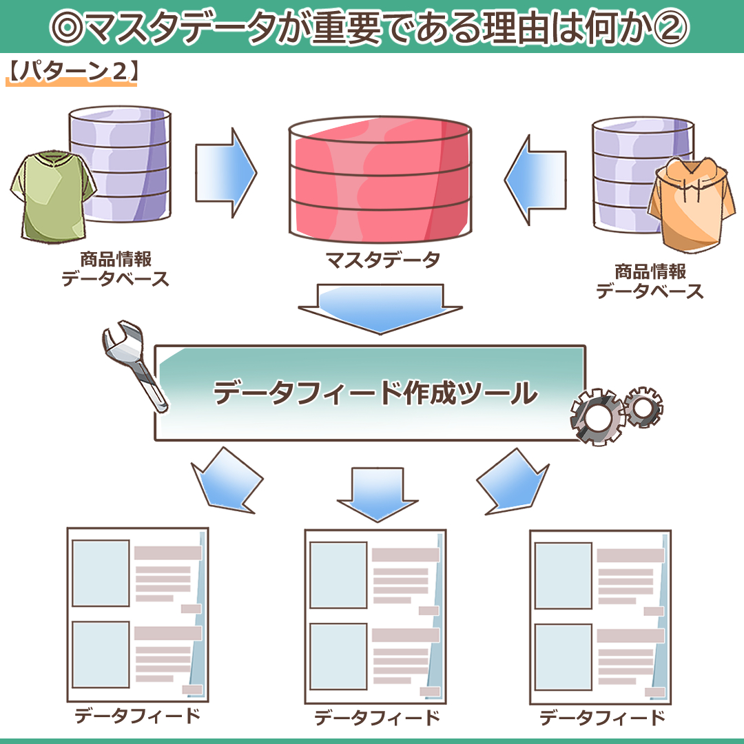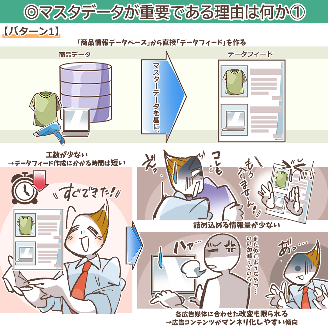 最近では、データ作成の省力化を考慮して「商品データからダイレクトにデータフィードを作成」している会社も多く、「マスタデータ」を知らない担当者も多くいます。