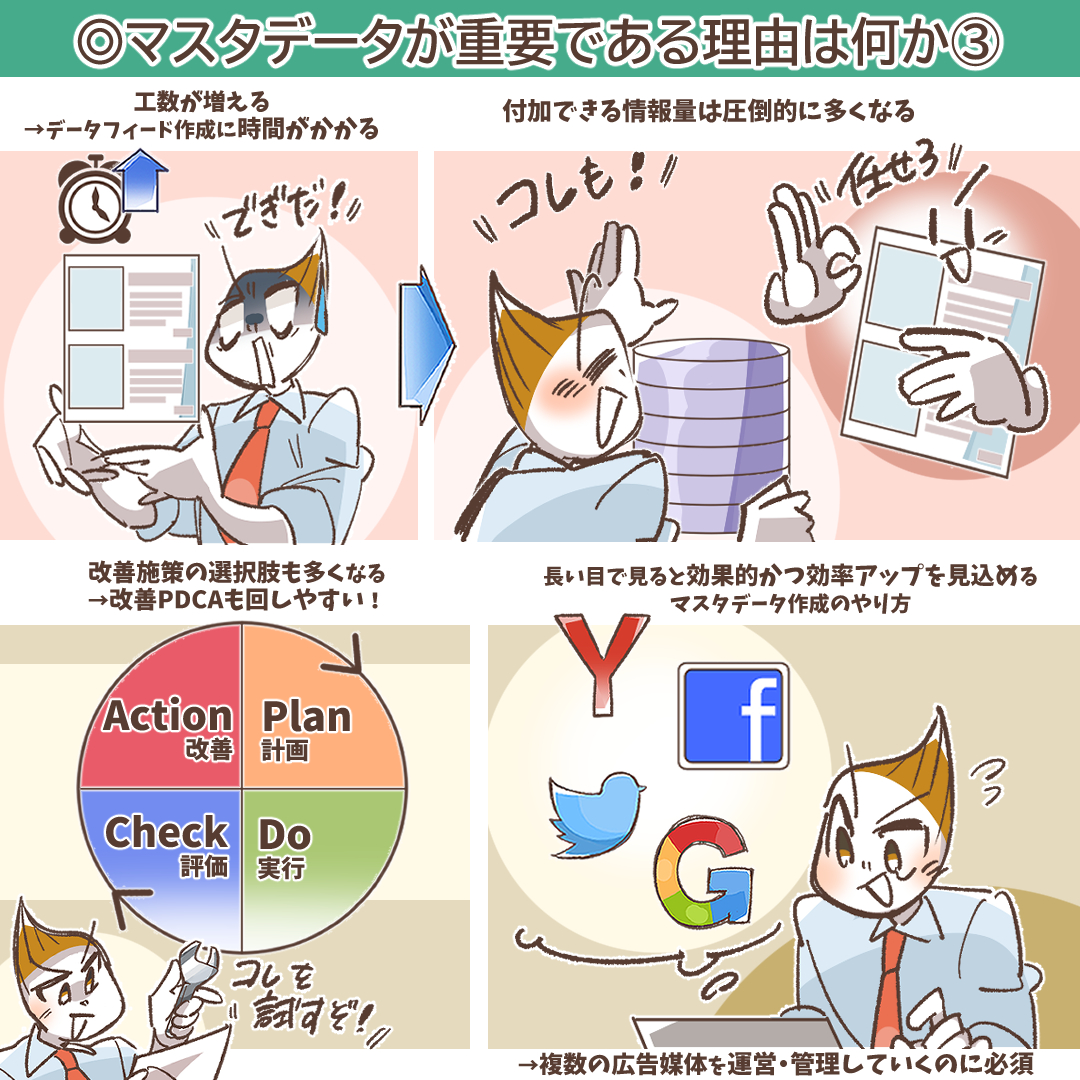 マスタデータが重要である理由は、データフィード広告の質や情報密度に大きく影響するからです。