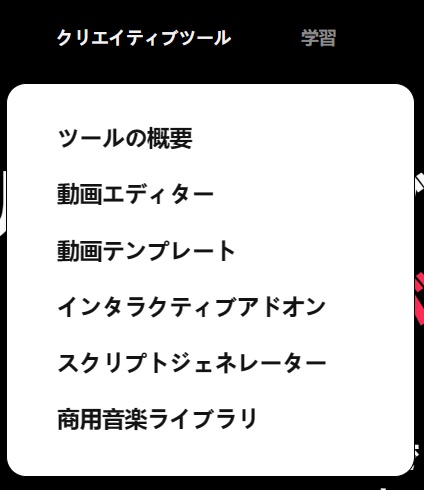 1.「TikTokクリエイティブセンター」に、あらかじめ作成しておいたTikTok for Businessアカウントでログインします。画面右上のメニューから「クリエイティブツール」にマウスカーソルを合わせると、利用可能なツールの一覧が表示されます。