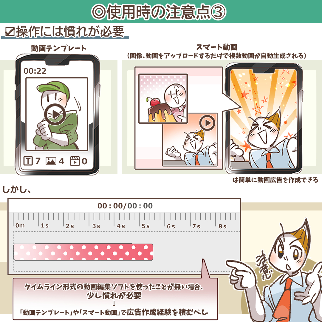 「動画テンプレート」やAIによる「スマート動画」は、数クリックで動画広告を作成できるため、学習コストはほぼゼロに近いと言えます。しかし、より自由度の高い「動画エディター」を使いこなし、意図した通りのクリエイティブを制作するには、ある程度の学習と慣れが必要です。特に、タイムライン形式の動画編集ソフトを全く使ったことがないという方は、最初は戸惑うかもしれません。