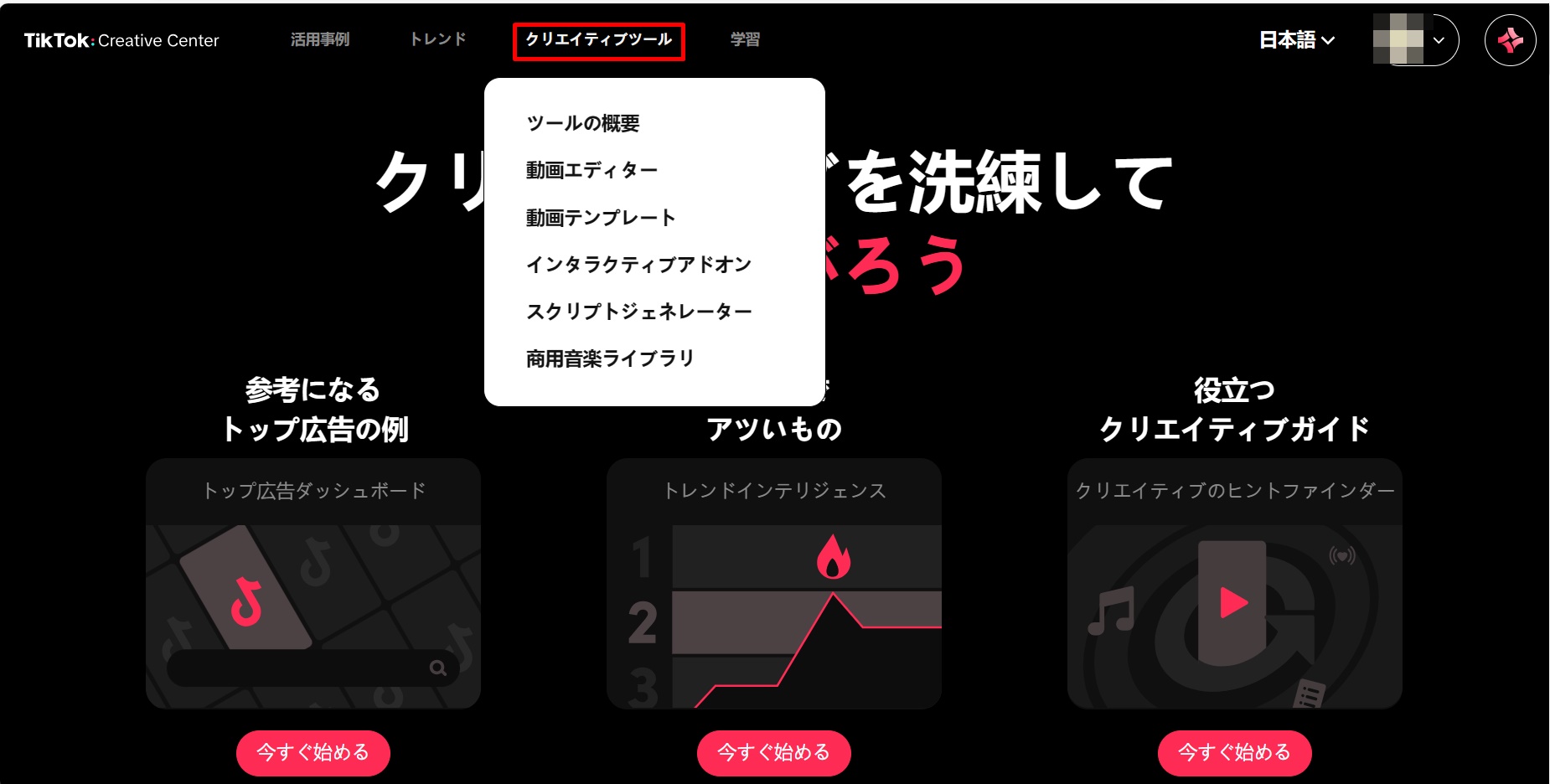 1.「TikTokクリエイティブセンター」に、あらかじめ作成しておいたTikTok for Businessアカウントでログインします。画面右上のメニューから「クリエイティブツール」にマウスカーソルを合わせると、利用可能なツールの一覧が表示されます。