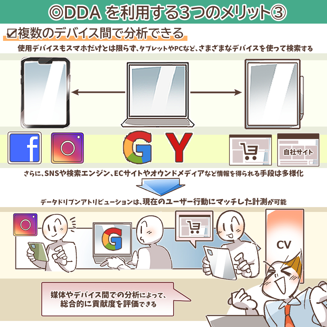 これにより、デバイスごとに分断されていたカスタマージャーニーを統合し、より全体像に近い形で貢献度を評価することが可能になります。例えば、「スマートフォンのディスプレイ広告は直接のコンバージョンは少ないが、多くのユーザーがPCでの指名検索に至る重要な起点となっている」といった、デバイスを横断したインサイトを得ることができます。ラストクリックモデルでは、各デバイスでの最後のクリックしか評価できないため、このようなデバイス間の相乗効果を捉えることは困難です。ユーザーの複雑な行動様式に即した評価ができる点も、DDAの大きなメリットの一つです。