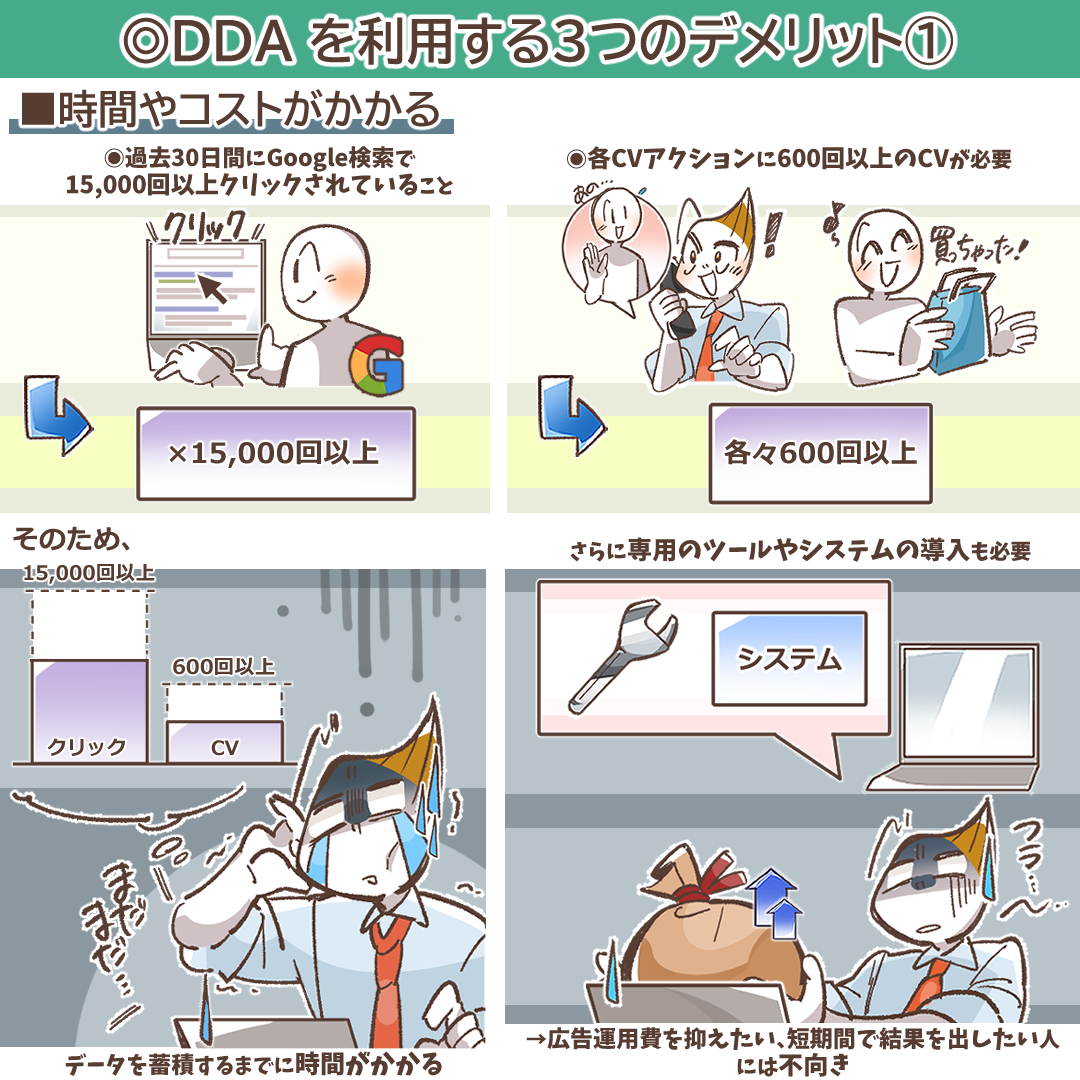 DDAの最大のハードルは、前述の通り、モデルの学習と精度維持のために一定量のデータが必要である点です。具体的には、「過去30日間にGoogle検索で3,000回以上のクリック」と「各コンバージョンアクションに300回以上のコンバージョン」という要件があります。この基準を満たすためには、相応の広告予算と運用期間が必要になります。特に、立ち上げたばかりのビジネスや、ニッチな商材を扱っていて検索ボリューム自体が少ない場合、コンバージョン数が少ないBtoB商材などの場合は、このデータ量を蓄積するまでに数ヶ月以上の時間がかかることも珍しくありません。