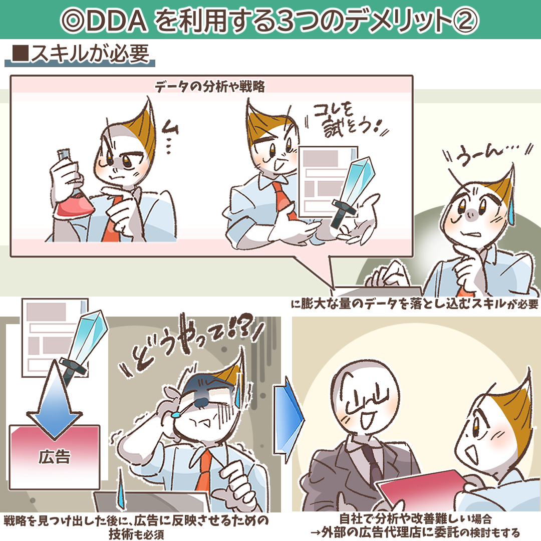 例えば、DDAの評価に基づいて予算を大きく変更した結果、予期せず全体のCPAが悪化する可能性もゼロではありません。その際に、なぜそうなったのかをDDAのロジックから直接解明することは困難です。そのため、運用者はDDAの結果を盲信するのではなく、あくまで「有力な判断材料の一つ」として捉える姿勢が重要です。具体的には、DDAの評価と、ラストクリックモデルでの評価、そしてビジネス全体の売上や利益といった最終的なKPIを常に比較検討し、多角的な視点から意思決定を行うスキルが求められます。分析結果を戦略に落とし込み、施策に反映させる技術、そしてその結果を正しく評価する能力がなければ、DDAを真に使いこなすことは難しいでしょう。自社での対応が困難な場合は、知見の豊富な外部の広告代理店に運用を委託することも有効な選択肢となります。