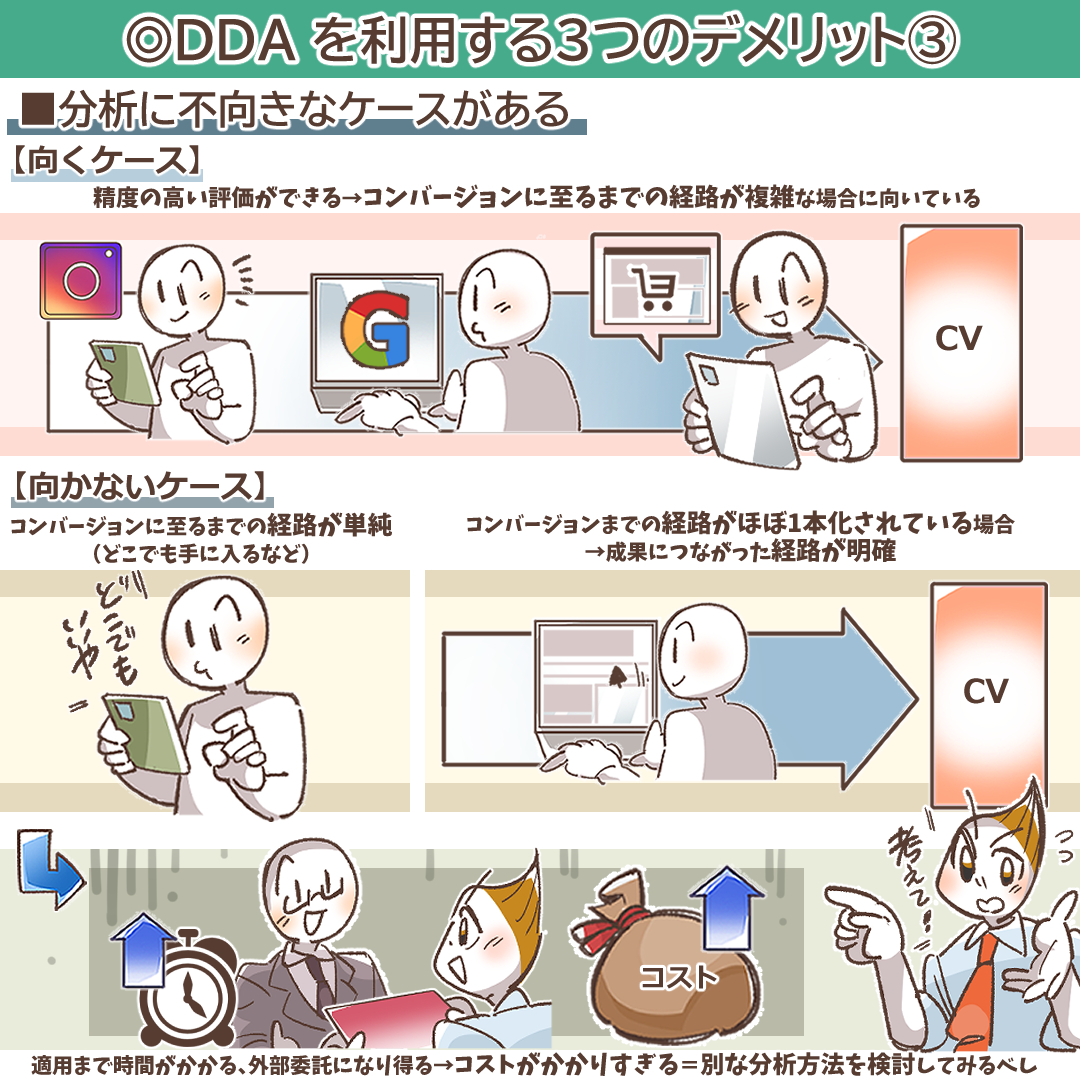 DDAが最も真価を発揮するのは、コンバージョンに至るまでの経路が複雑で、複数の広告接点が存在する場合です。逆に言えば、カスタマージャーニーが非常に単純な商材やサービスの場合、DDAを導入するメリットは限定的です。