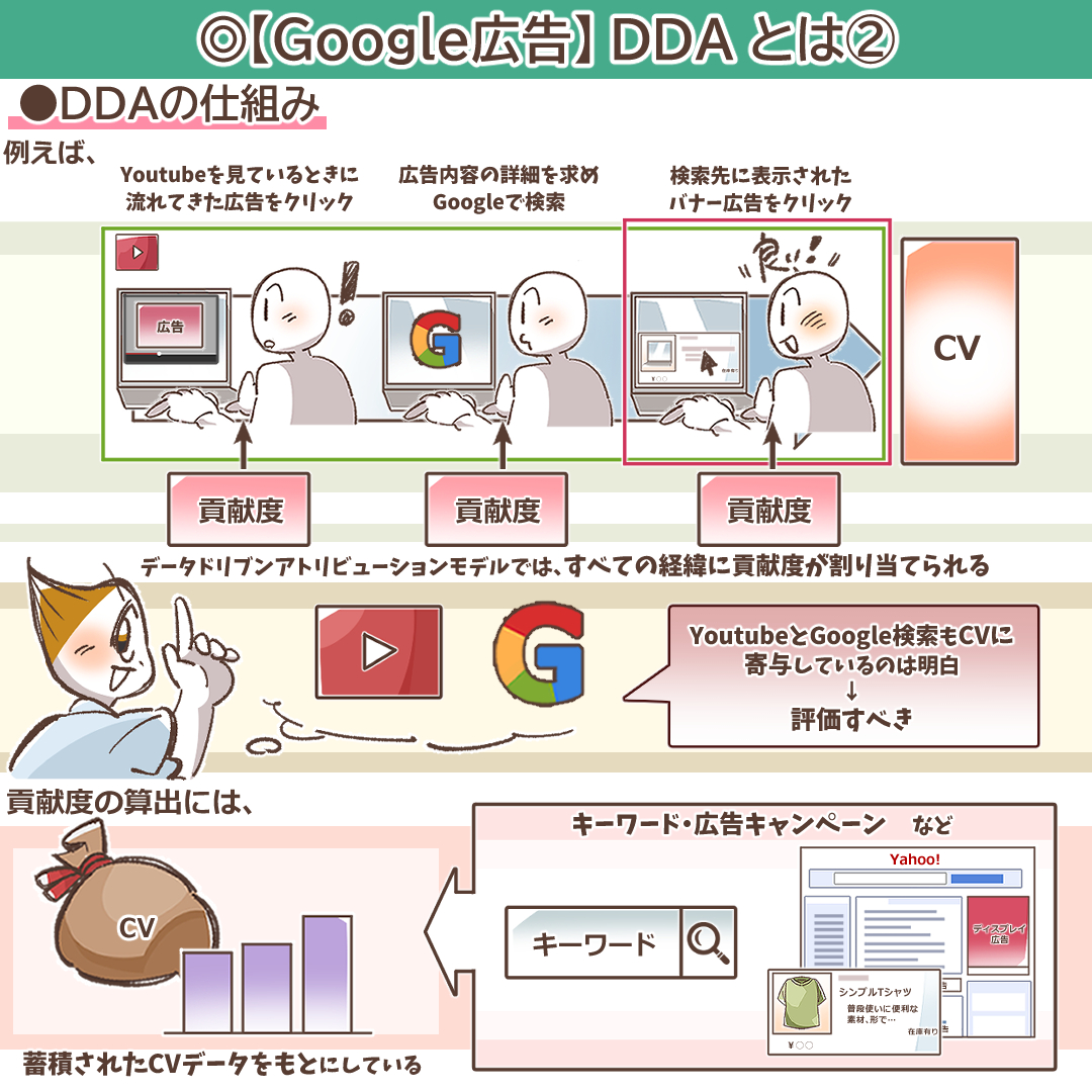 具体的な例を挙げてみましょう。あるユーザーが「YouTube広告クリック → 検索広告Aクリック → 商品購入(CV)」という経路を辿ったとします。この場合、DDAは以下のような分析を行います。