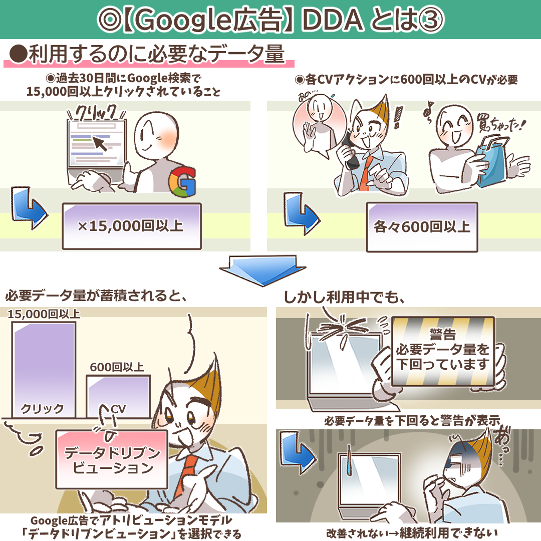なお、一度DDAの利用を開始した後でも、コンバージョン数がこの基準を継続的に下回った場合、Google広告の管理画面に警告が表示されます。その後30日間データ量が回復しないと、アトリビューションモデルが自動的に「線形」などに変更される可能性があるため注意が必要です。