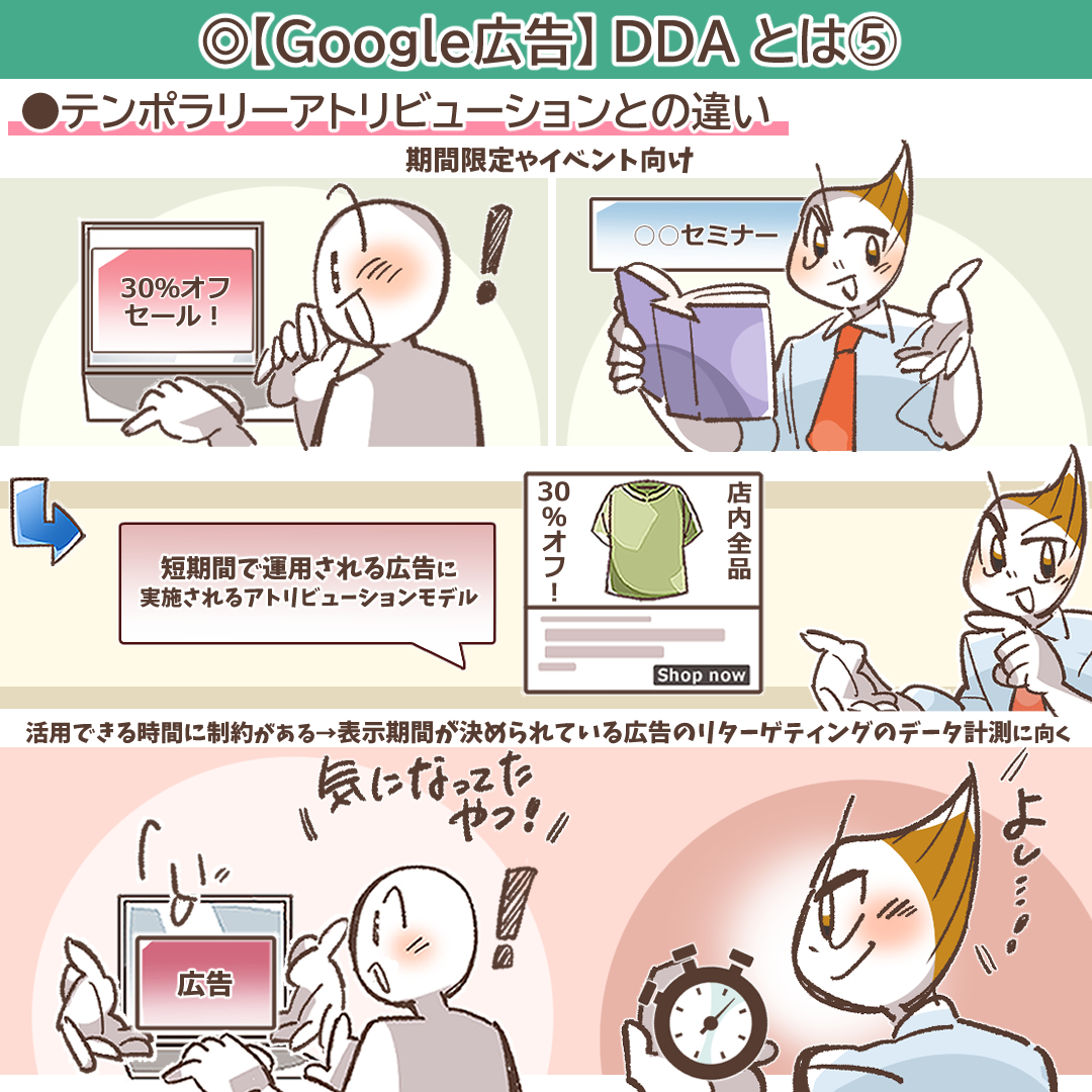 DDAとしばしば混同される用語に「テンポラリーアトリビューション」がありますが、これは全く異なる概念です。テンポラリーアトリビューションは、特定の期間やイベント(例:年末セール、新商品発売キャンペーン)に限定して、その期間内の広告効果を測定するための分析手法やモデルを指します。短期間で集中的に投下される広告キャンペーンのリターゲティング効果などを計測する際に用いられることがあります。これは、Google広告の標準機能として提供されている「モデル」ではなく、分析の「考え方」や「アプローチ」の一つと捉えるのが適切です。恒常的な広告運用全体の貢献度を評価するDDAとは、その目的と時間軸が大きく異なります。