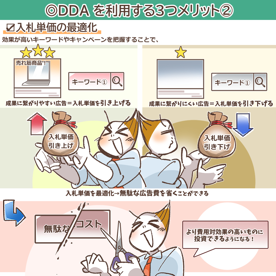 DDAによる貢献度の再評価は、入札単価の最適化にも直結します。これまで「効果が低い」と判断して低く設定していたキーワードの入札単価を引き上げ、より多くのインプレッションとクリックを獲得しにいく、といった戦略的な調整が可能になります。このプロセスは、特にGoogle広告の自動入札戦略(「コンバージョン数の最大化」や「目標コンバージョン単価(tCPA)」、「目標広告費用対効果(tROAS)」など)と組み合わせることで、絶大な効果を発揮します。