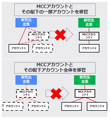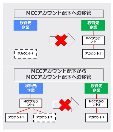 また以下の図どちらのパターンにおいても、MCCアカウントの下へ属するように移管することはできません。