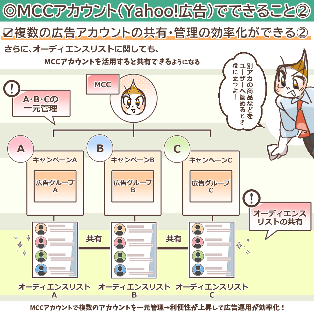 またYahoo! 広告が提供するMCCアカウントを活用すると、オーディエンスリストをアカウント間で共有したり、いくつかの広告アカウントを跨ぎながらレポート作成したりできます。