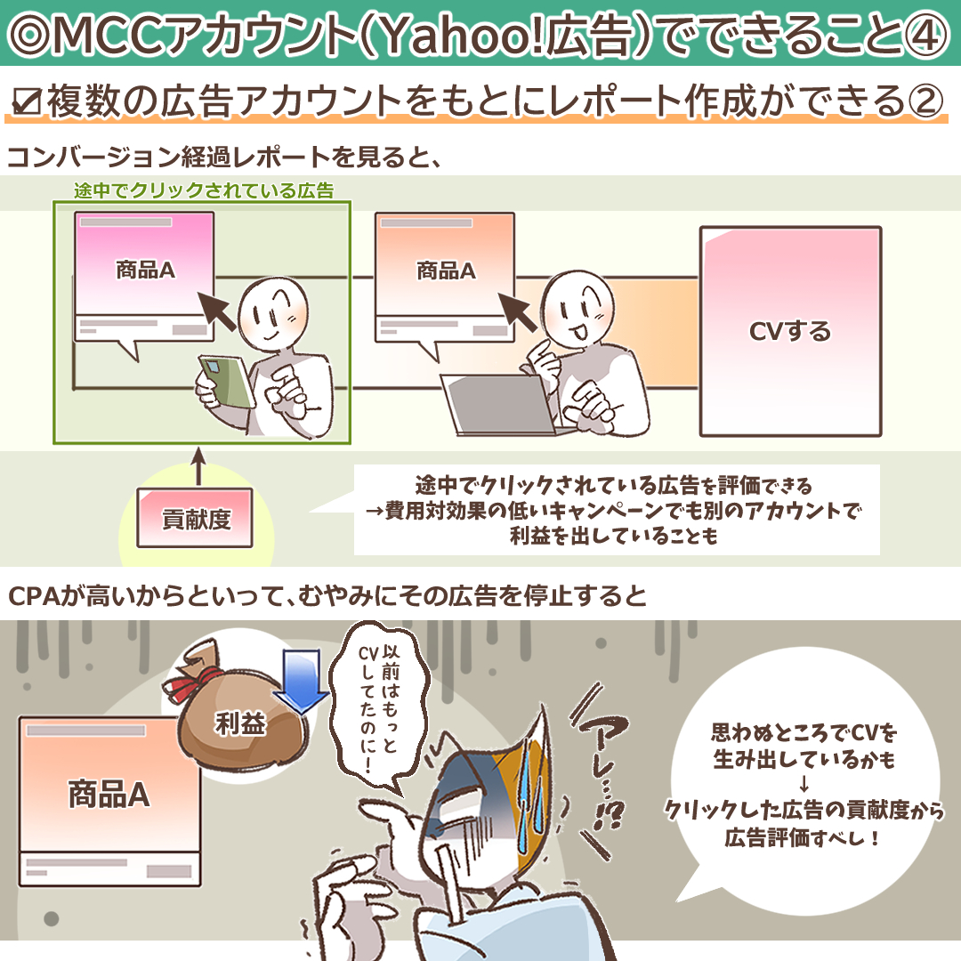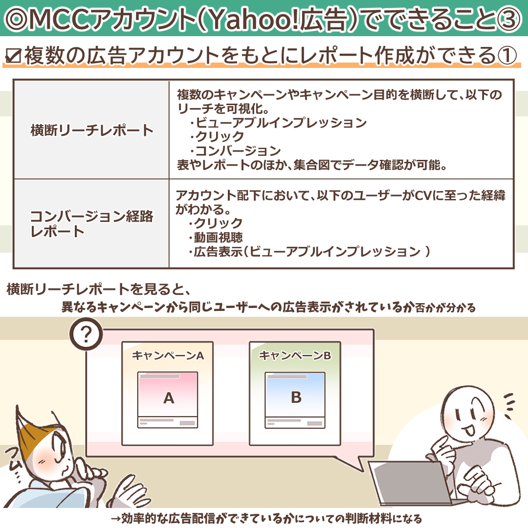 Yahoo! 広告が提供するMCCアカウントの利用によって、以下2つのレポート作成ができます。