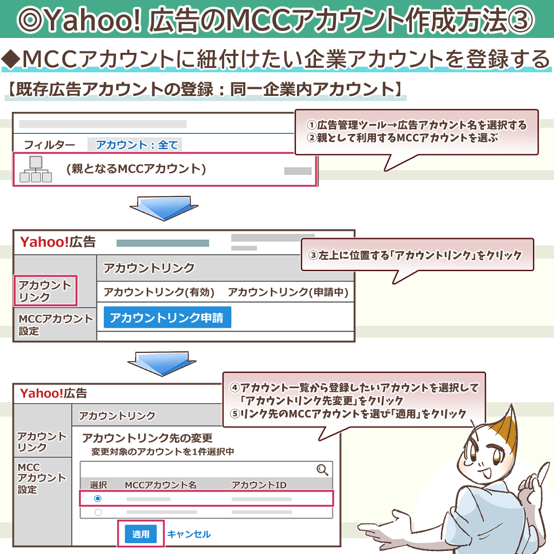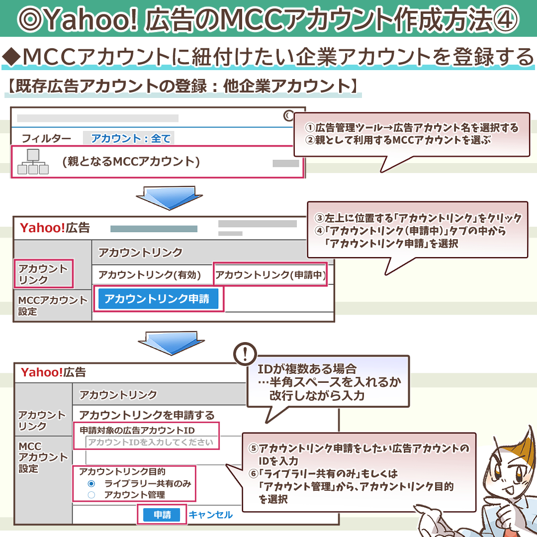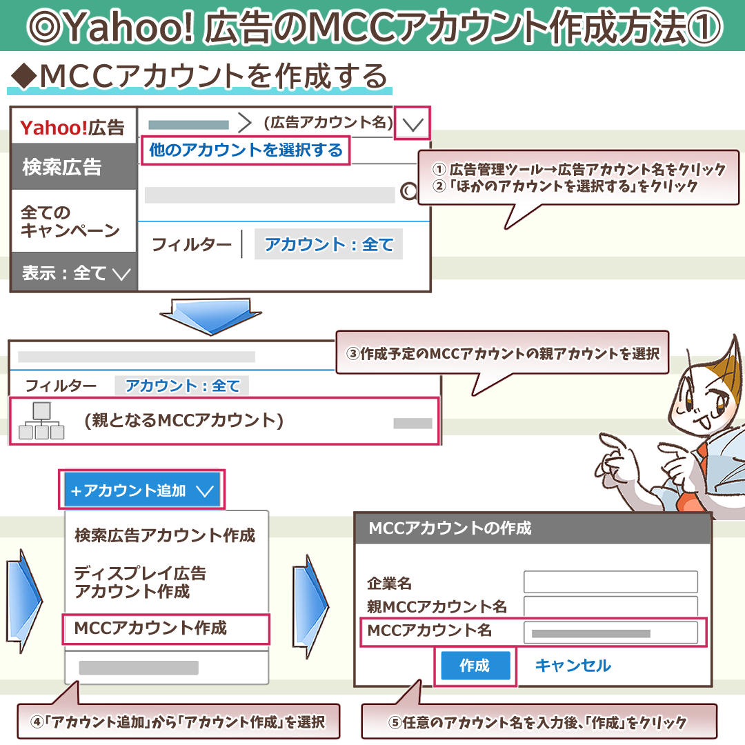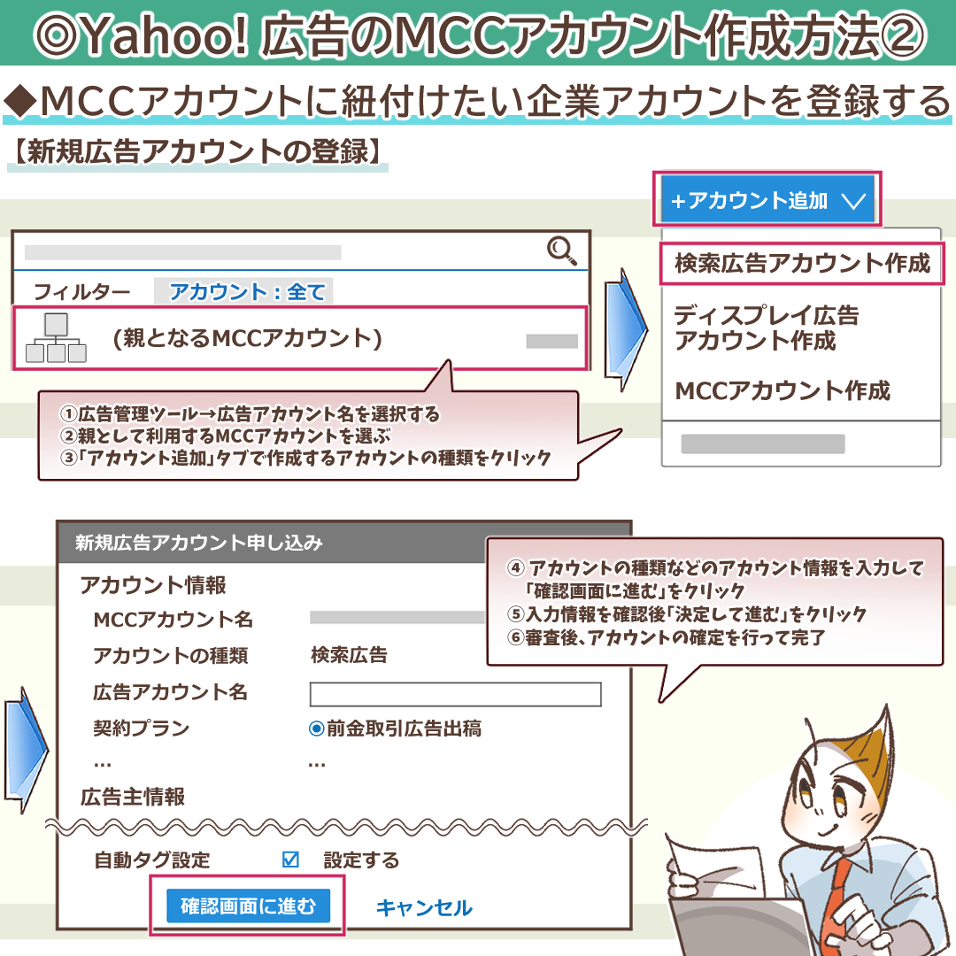 続いてYahoo! 広告のMCCアカウントを実際に作成する手順と、企業アカウントとの紐付け作業について詳しく見ていきましょう。