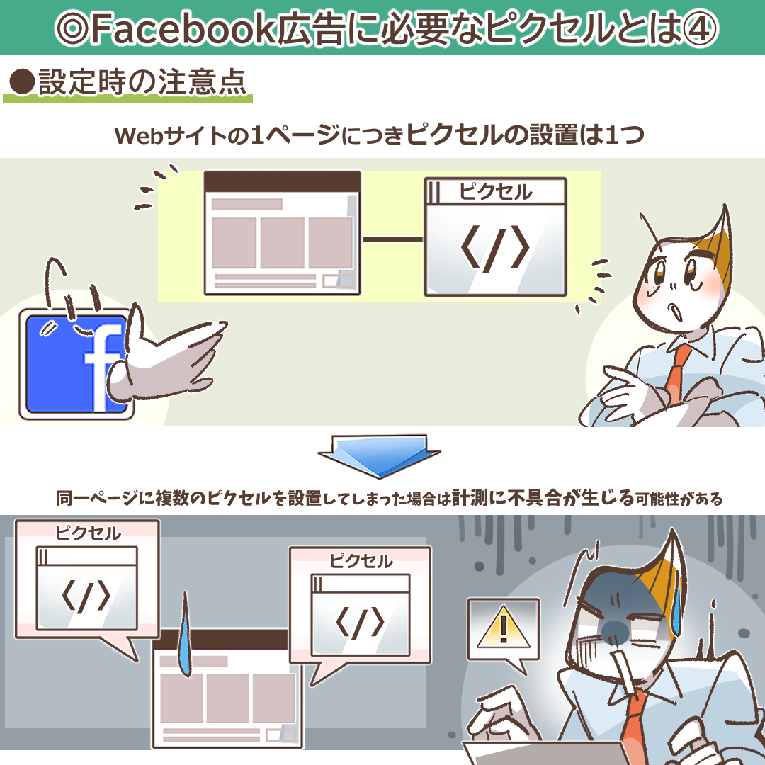 設定時によくある間違いとして、同一ページに複数のピクセルを設置してしまう、あるいは同じピクセルコードを二重に設置してしまうというものがあります。これは、サイトリニューアル時や、複数の担当者が別々に作業した場合などに起こりがちです。ピクセルが重複して設置されると、1回のユーザー行動に対して2回分のイベントが送信されてしまうため、コンバージョン数が実際の2倍に計上されたり、リターゲティングリストが不必要に膨れ上がったりといった問題が発生します。レポート上の数値が異常に良く見えてしまうため、一見問題に気づきにくいかもしれませんが、これは広告費の配分や事業判断を誤らせる極めて深刻なデータ汚染です。アルゴリズムもまた、この誤ったデータを基に学習を進めてしまうため、広告の最適化はあらぬ方向へと進んでしまいます。原則として、1つのウェブサイト(またはビジネス)に対して、使用するピクセルは1つです。Pixel Helperを使えば、ページに設置されているピクセルのIDと数を確認できるため、定期的な監査を行い、意図しないピクセルが設置されていないかをチェックすることが重要です。これにより、データ計測の信頼性の根幹を守ることができます。