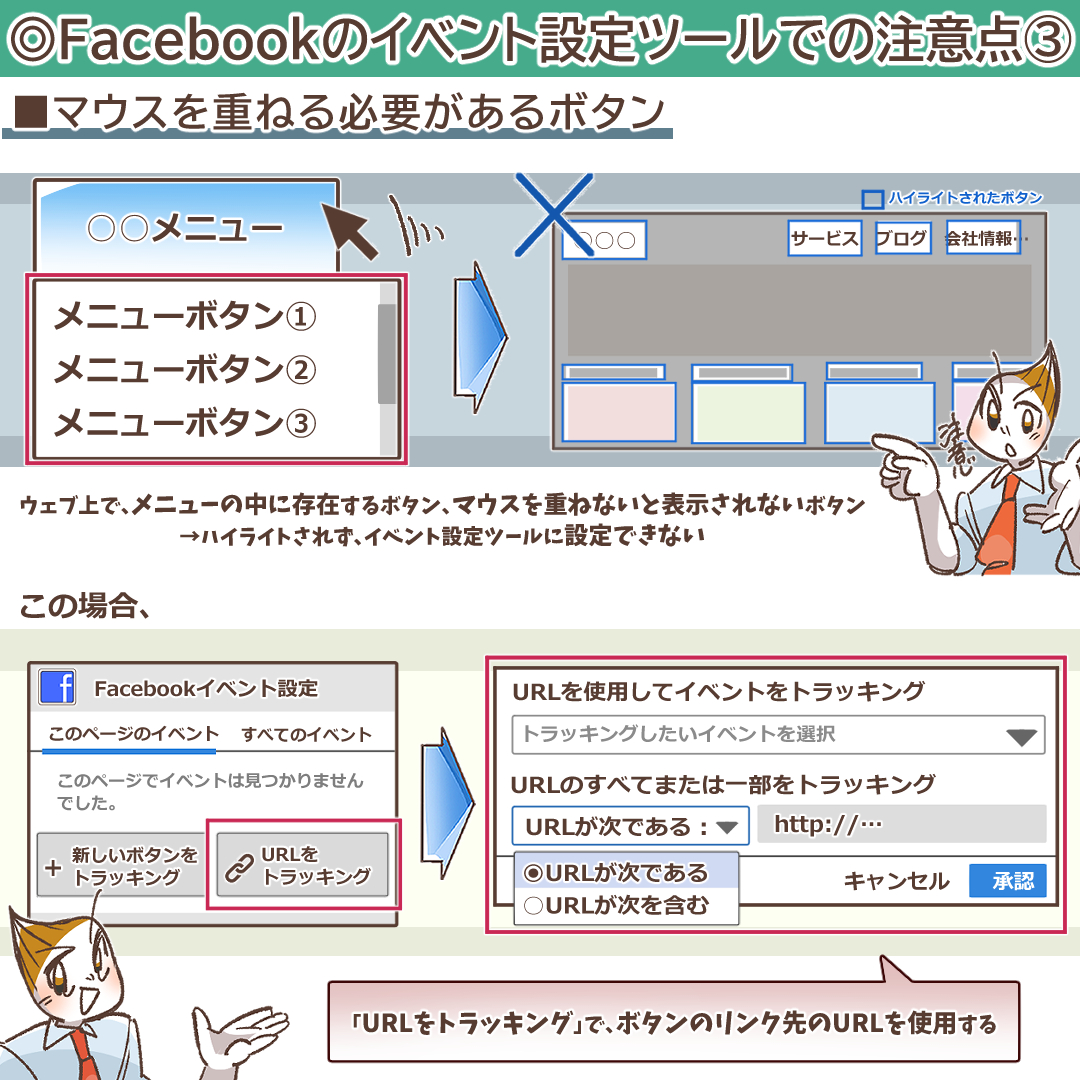 ナビゲーションメニューの中に隠れていて、マウスを重ねる(マウスオーバー)ことで初めて表示されるボタンも、イベント設定ツールでの直接的なトラッキングが困難な場合があります。これも技術的な制約の一つですが、ここから学ぶべきは、ユーザーの特定のインタラクションに依存する要素の計測には工夫が必要であるという点です。この場合の解決策として、ボタンクリック後の遷移先ページのURLをトラッキングするという方法があります。つまり、「ボタンのクリック」という直接的な行動(イベント)ではなく、「特定のページへの到達」という結果を以て、間接的にコンバージョンを計測するわけです。このように、一つの方法に固執せず、ユーザーの行動フロー全体を俯瞰し、計測可能な代替ポイントを見つけ出す柔軟な思考が、複雑なウェブサイトにおける正確なデータ計測を実現します。