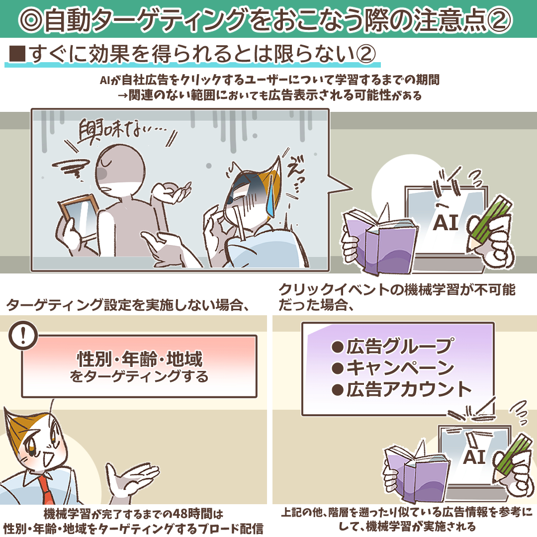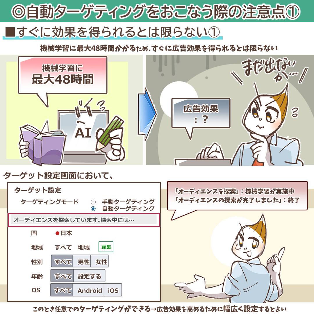 また、ターゲティング設定(地域、性別、年齢、OS)を何も指定せずに自動ターゲティングを開始した場合、この機械学習が完了するまでの最大48時間は、これらのデモグラフィックセグメントによる絞り込みが行われない、いわゆる「ブロード配信」の状態となります。これは、最も広範なユーザーから学習データを収集するための仕様です。