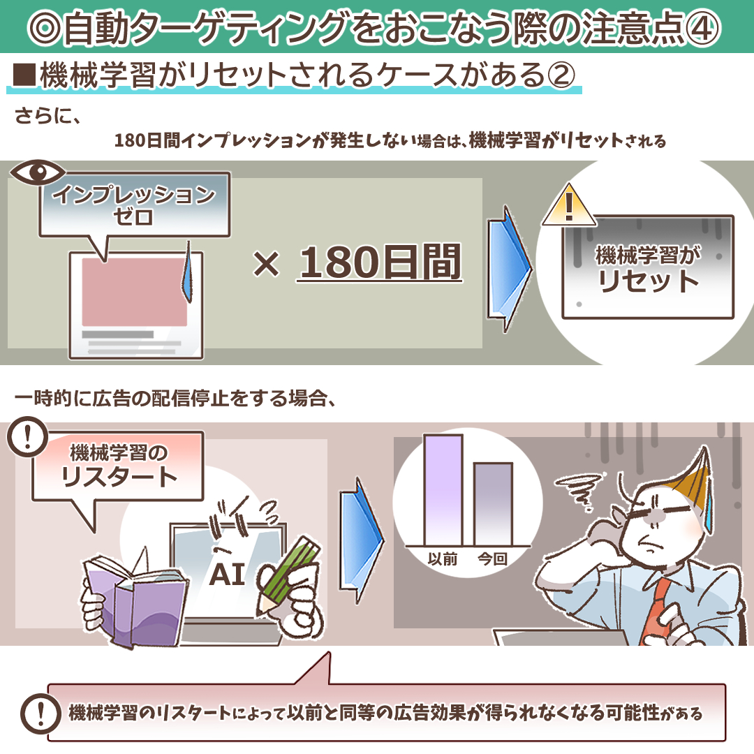 自動ターゲティングの運用において、細心の注意を払うべきもう一つの重要なポイントは、せっかく蓄積された機械学習の成果がリセットされてしまうリスクが存在する、という点です。学習がリセットされると、AIは再びゼロからデータを収集し直す必要があり、パフォーマンスが安定するまでに再度学習期間を要することになります。このリセットは、主に二つのケースで発生します。