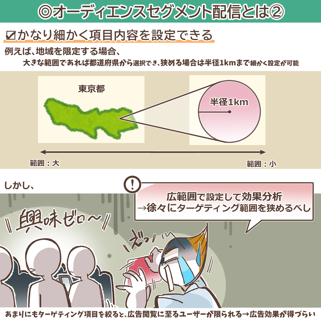 例えば、「地域」セグメントでは、都道府県や市区町村といった大きな行政区分での指定はもちろんのこと、特定の地点からの半径(例:店舗から半径1km、3km、5kmなど)を指定した、より精度の高いジオターゲティングが可能です。これにより、実店舗への来店を促進したいビジネスなどでは、商圏内の潜在顧客に効率的にアプローチできます。