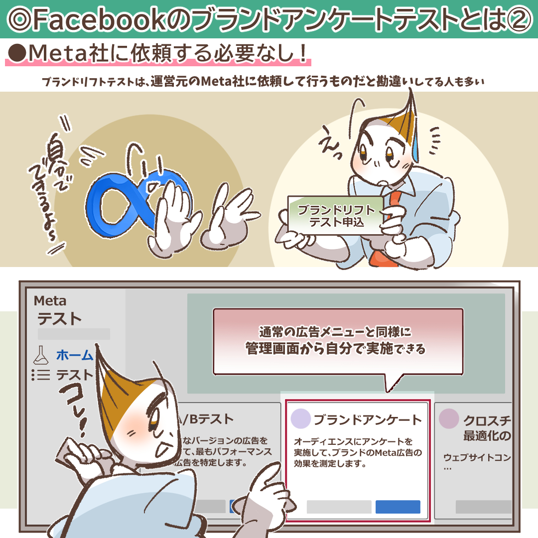このような、直接的なコンバージョン数には現れない広告効果、すなわち「ブランドに対するユーザーの意識変容」を科学的に測定する手法が「ブランドリフト」であり、Meta社(旧Facebook社)が提供する広告プラットフォームでは、このブランドリフトを測定するための強力なツール「ブランドリフト調査」を利用することができます。特に、その中核をなす「ブランドアンケートテスト」を実施することで、自社の広告に接触したユーザーが、広告に接触しなかったユーザーと比較して、ブランドや商品に対してどのような意識の変化を示したのかを、統計的に信頼性の高いデータとして把握することが可能となります。これは、感覚や推測に頼りがちだった広告クリエイティブやターゲティングの評価を、客観的なデータに基づいて行うための重要なステップです。