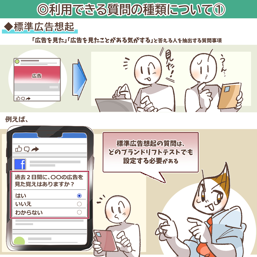 ブランドアンケートテストの成果は、どのような質問を設定するかによって大きく左右されます。ここでは、Meta広告で利用可能な標準的な質問の種類と、それぞれがどのような広告課題の測定に適しているのかを詳しくご紹介します。これらの質問項目の中から、キャンペーンの目的に合わせて最大3問(必須の「標準広告想起」を含む)まで設定することが可能です。