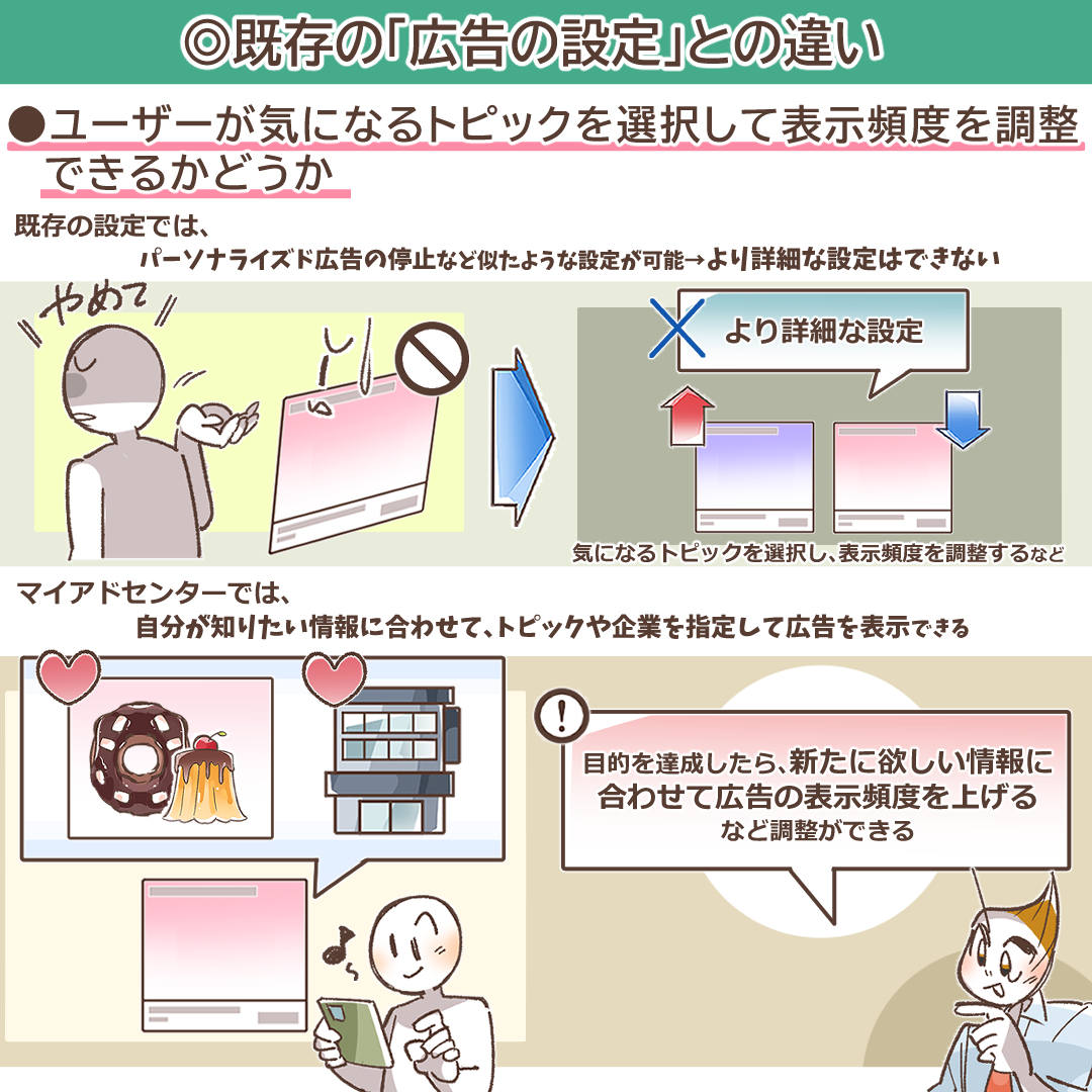 既存の広告設定でも、パーソナライズド広告の停止など似たような設定が可能でした。それではマイアドセンターと既存の広告の設定では何が違うのでしょうか。