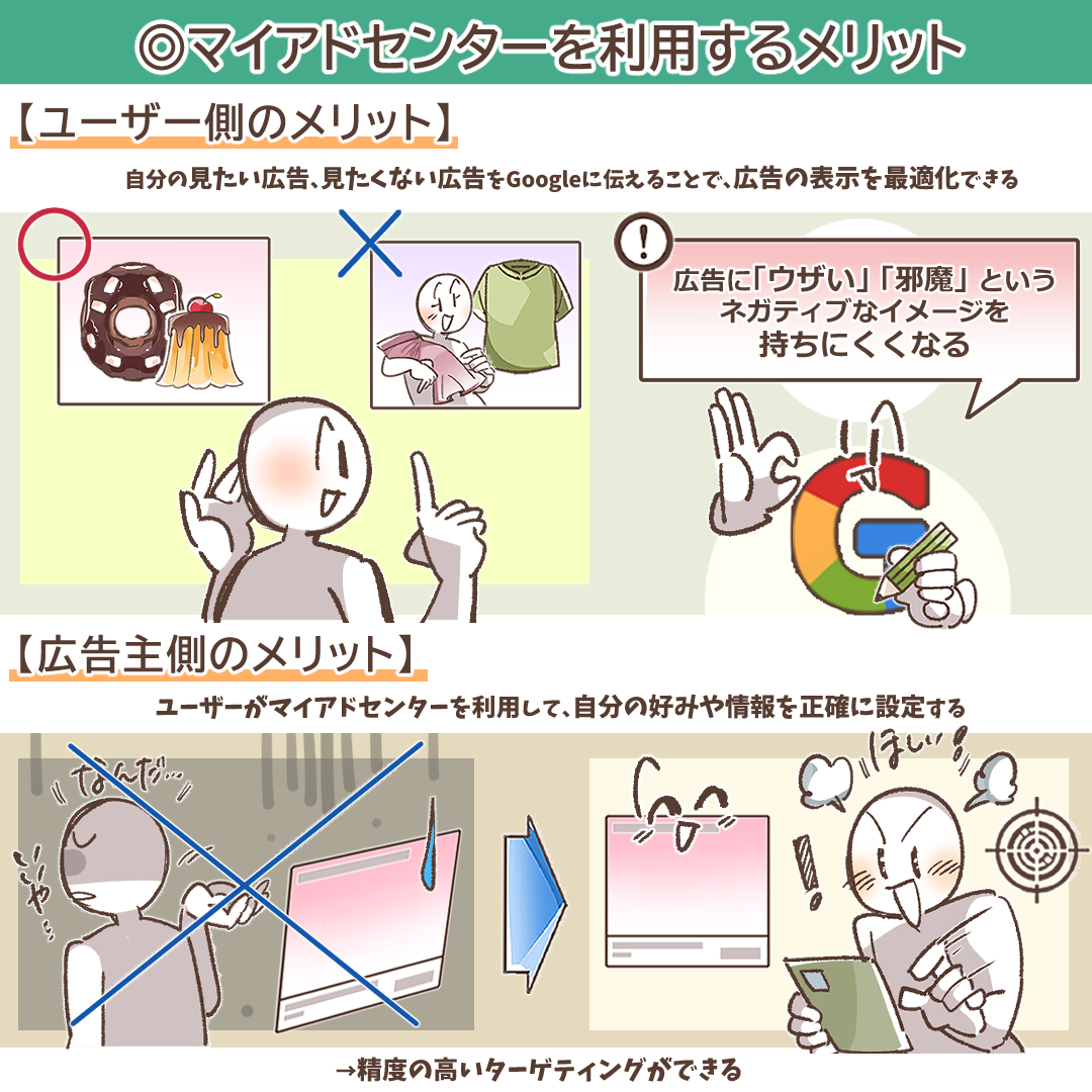 広告主側はユーザーがマイアドセンターを利用して、自分の好みや情報を正確に設定することで、精度の高いターゲティングができる可能性があります。