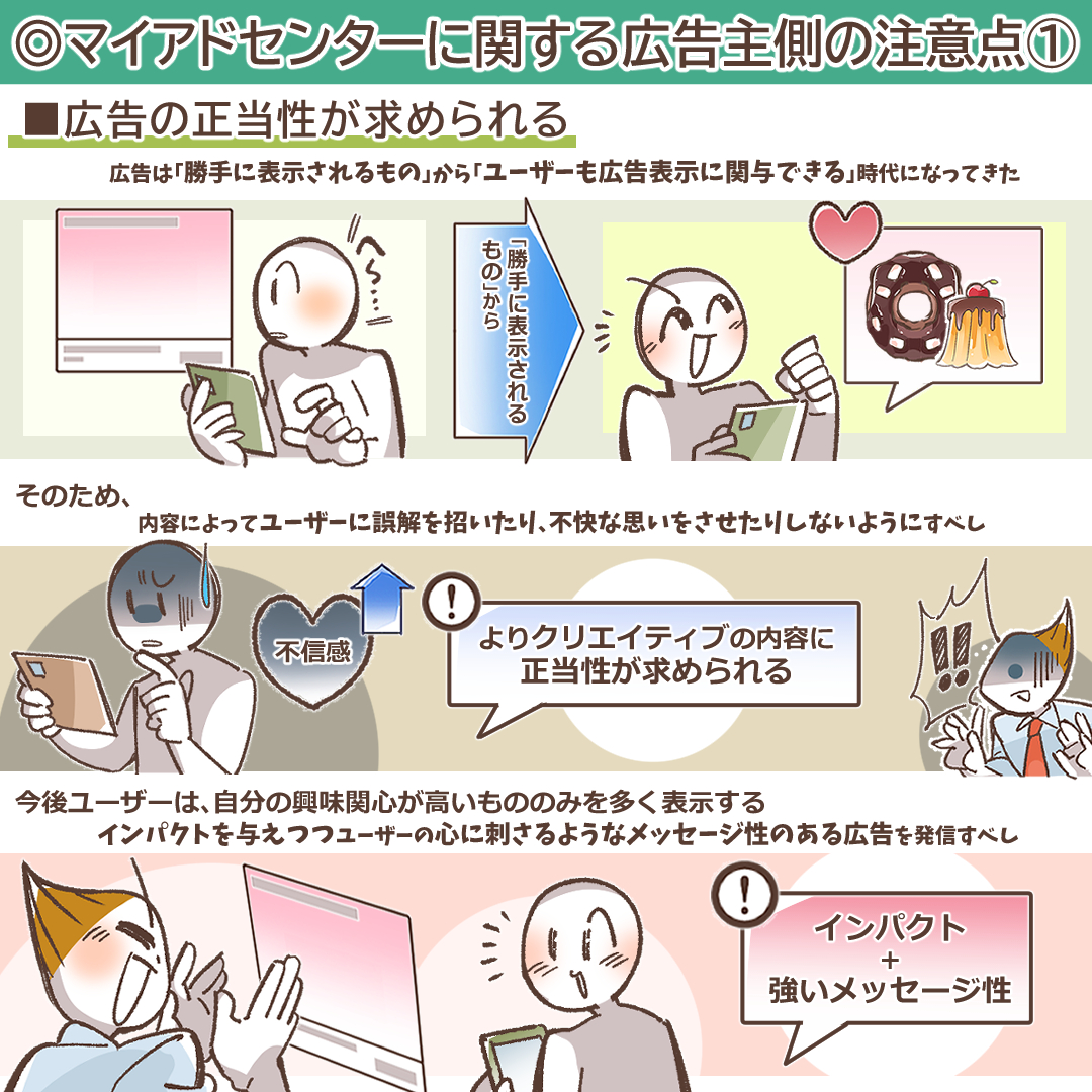 ユーザーにとってはメリットのあるマイアドセンターですが、広告主側は次の点に注意しなくてはいけません。