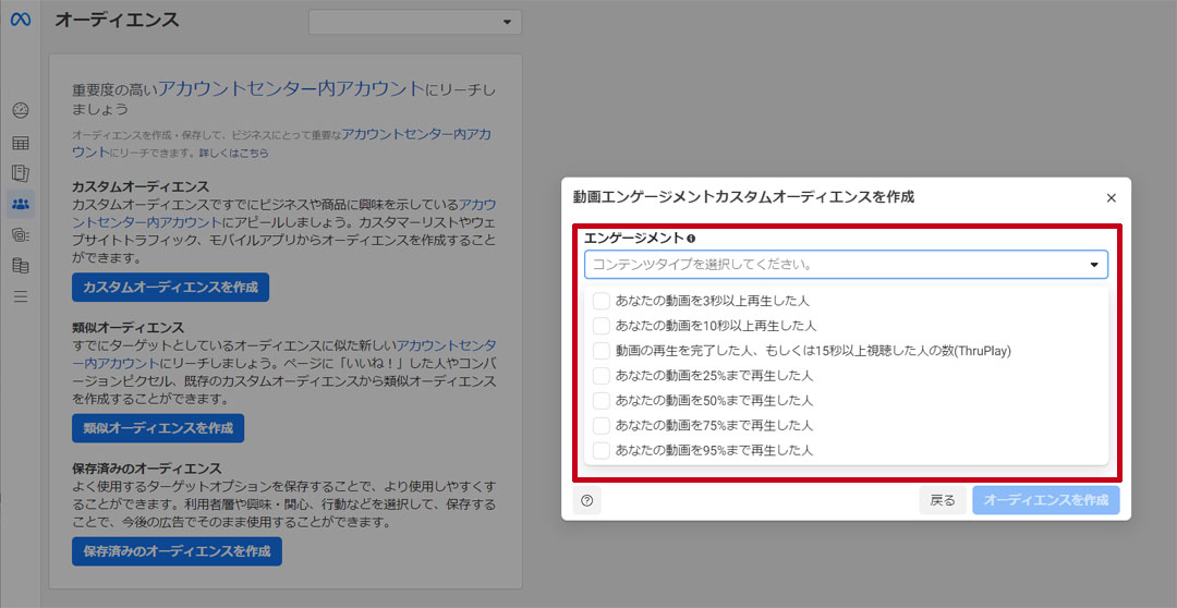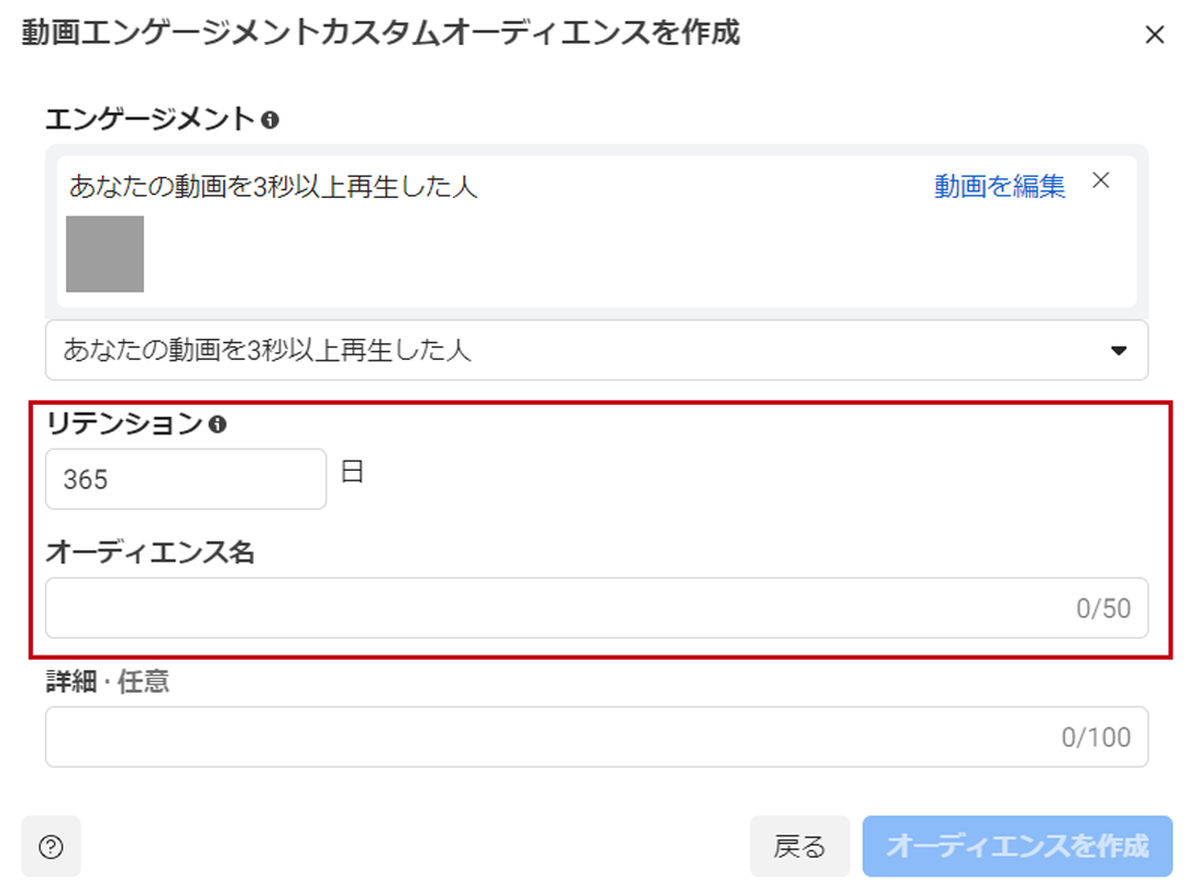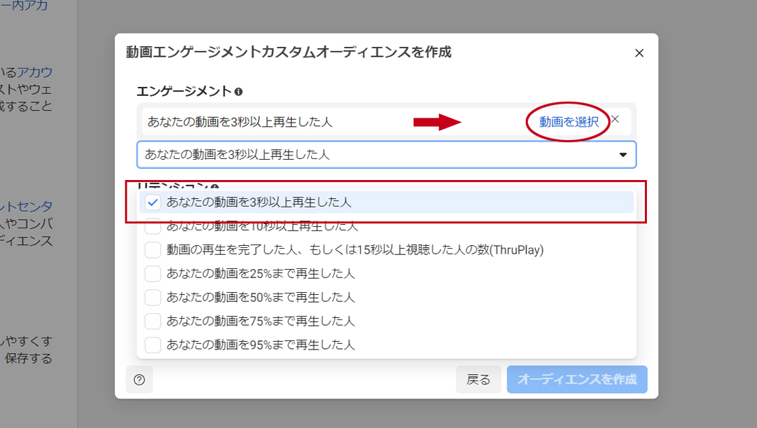 動画広告を再生した秒数や動画の尺に対する割合でオーディエンスが作成されます。