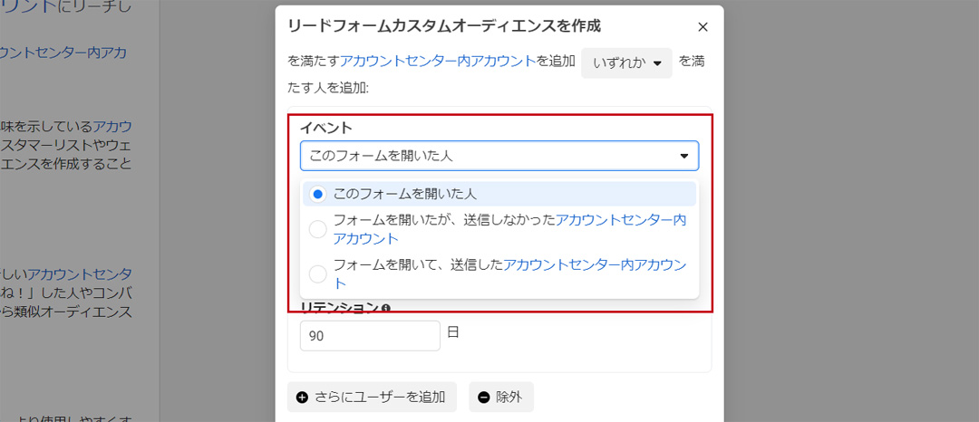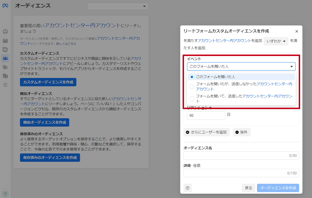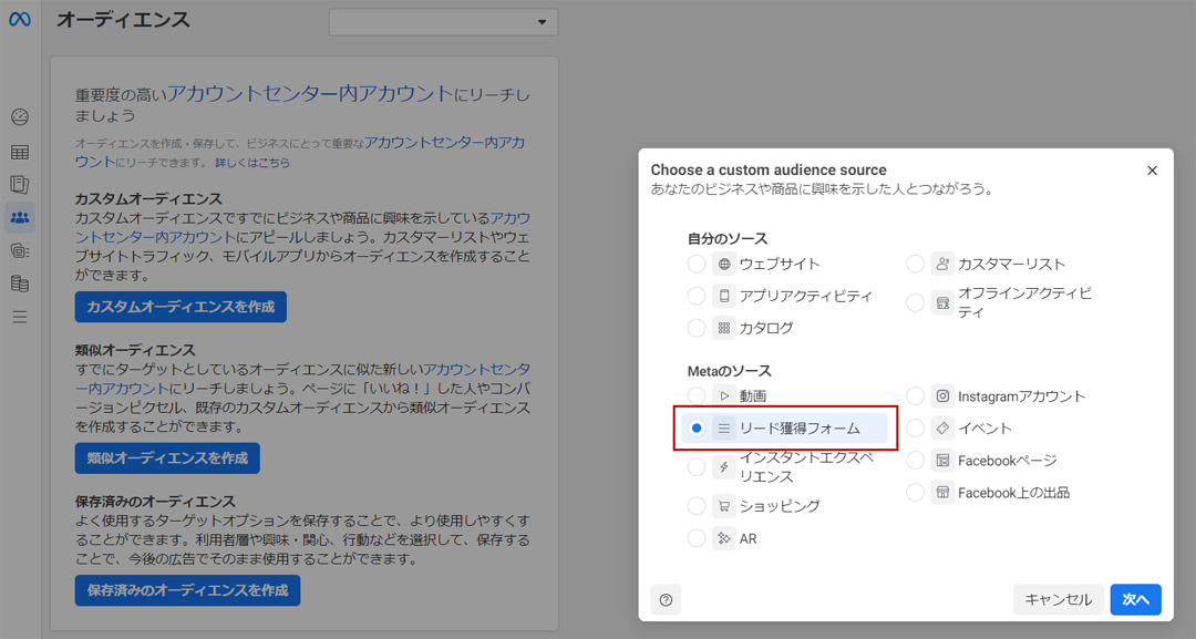 FacebookまたはInstagramのどちらかで「リード獲得広告」を利用している広告アカウントであれば、フォームへのアクションに関連したカスタムオーディエンスが作成できます。