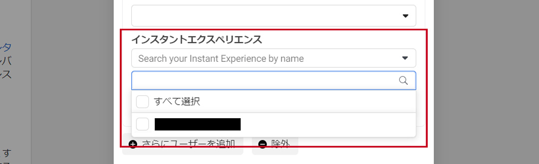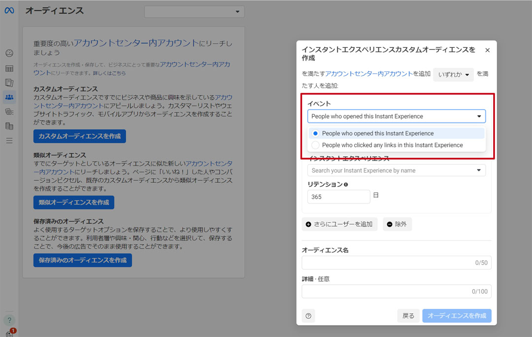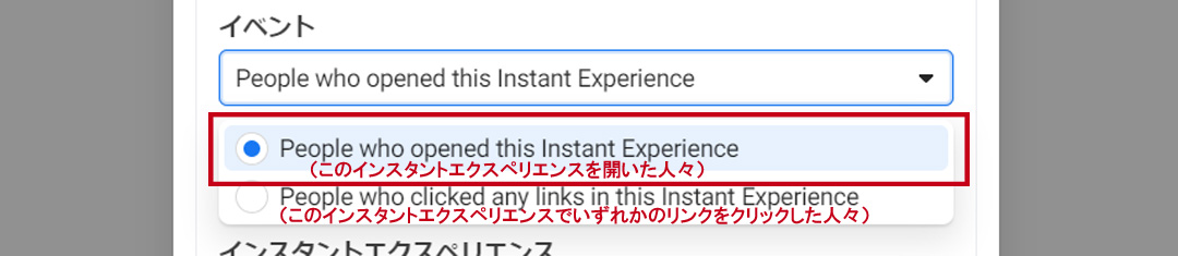 今回の例では、People who opened this Instant Experience(このインスタントエクスペリエンスを開いた人々)を選択しました。広告管理画面上では英語表記なのでわかりにくいので、上の図では英文の訳を入れています。