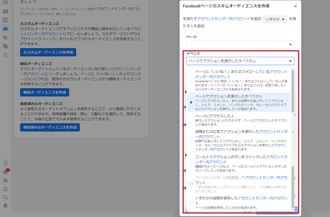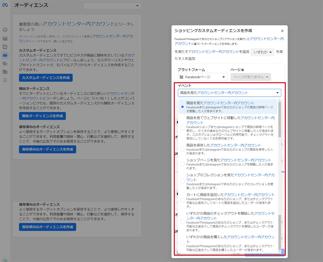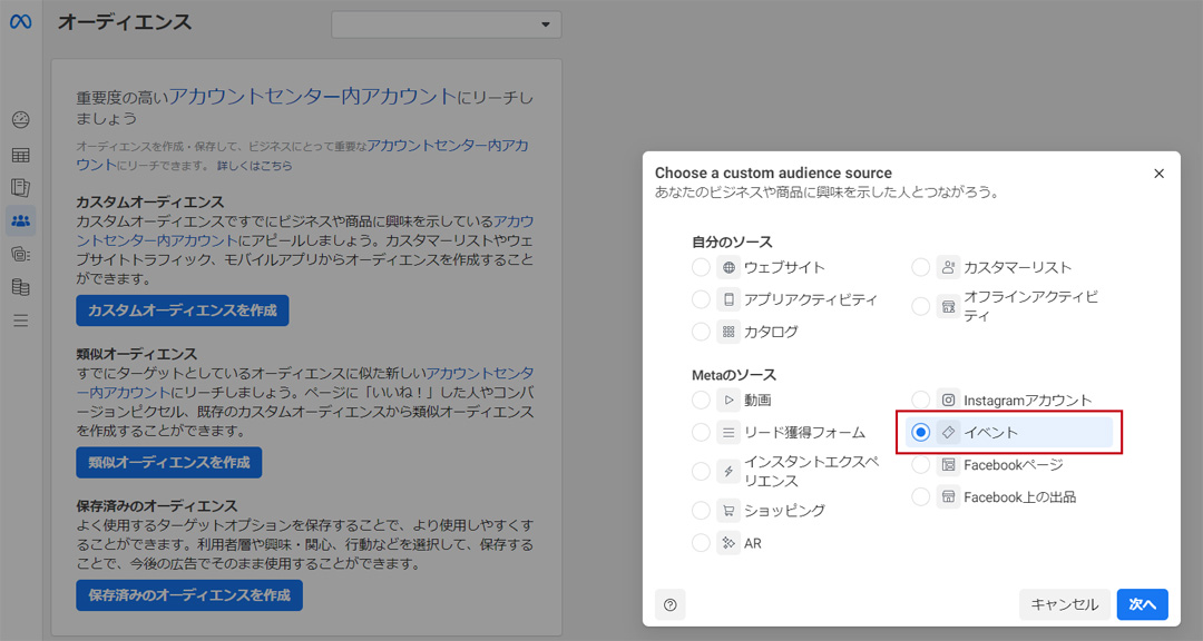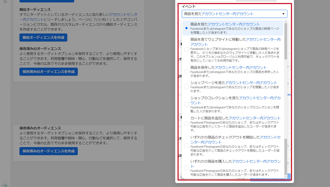 Facebookページカスタムオーディエンスの「イベント」から、利用したいものを選択しましょう。