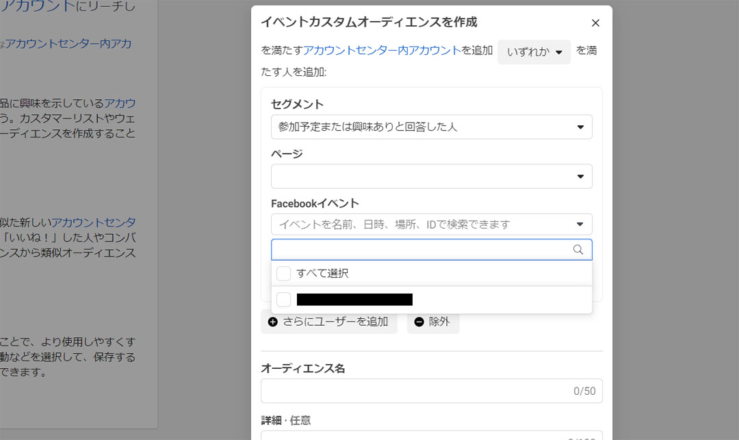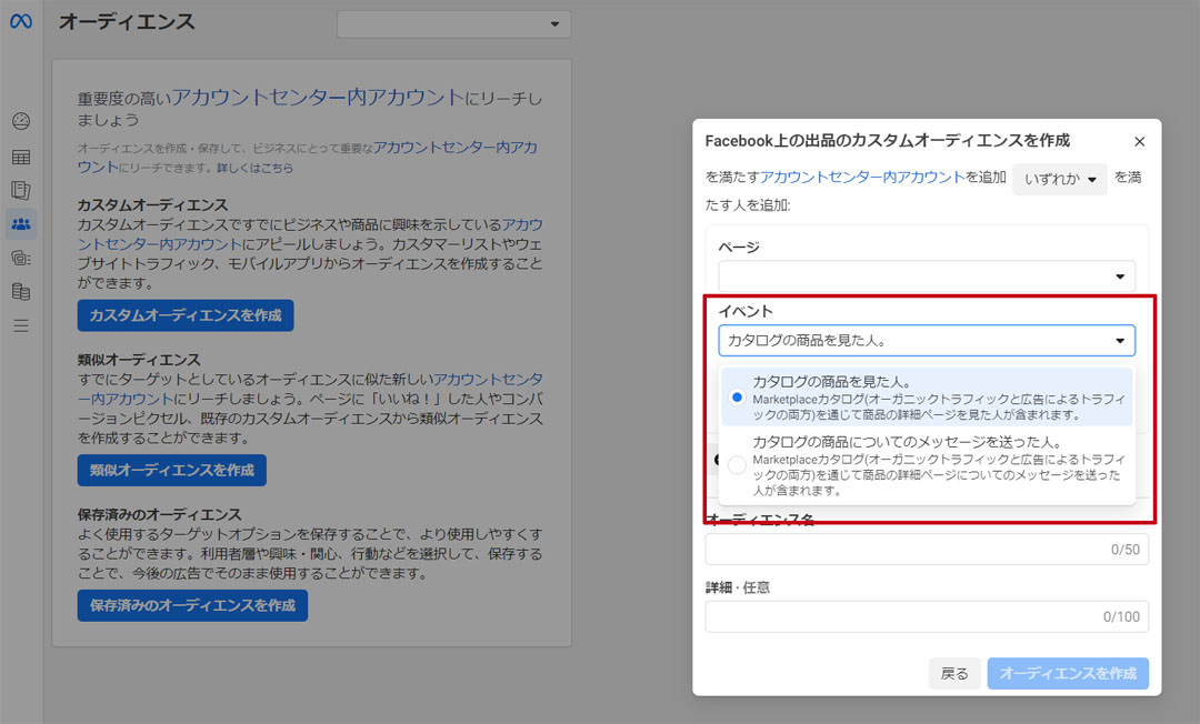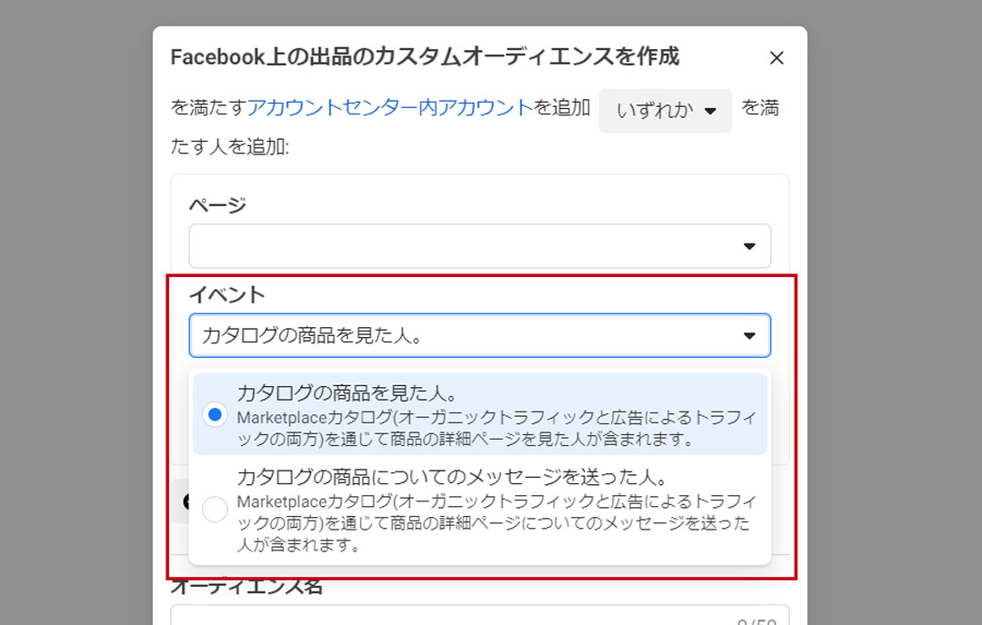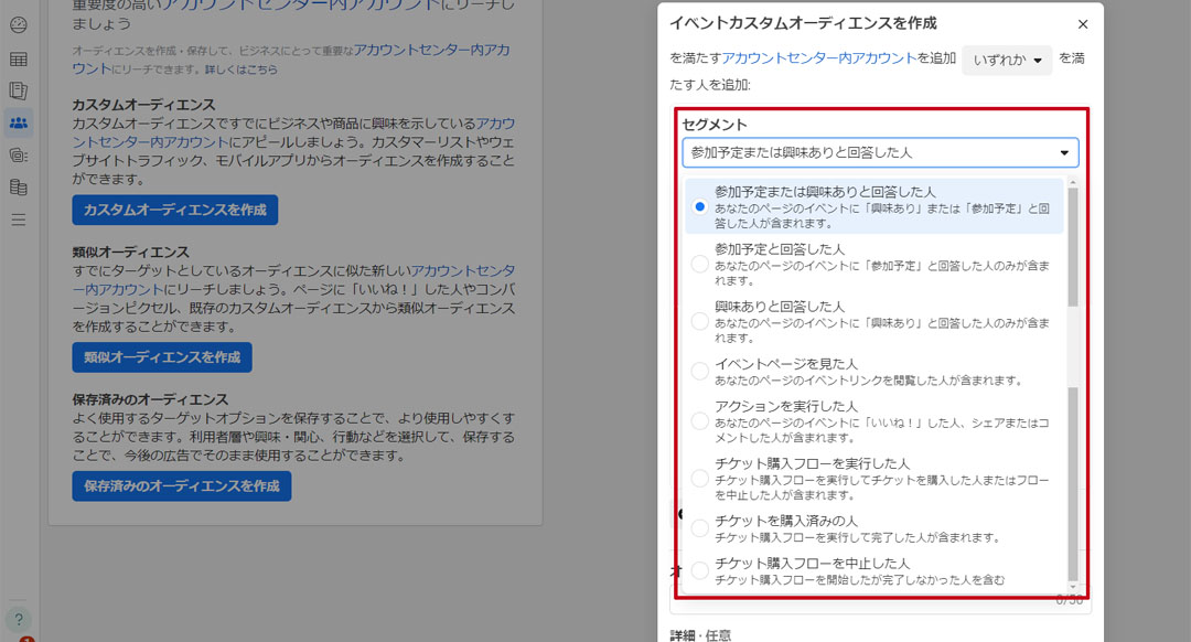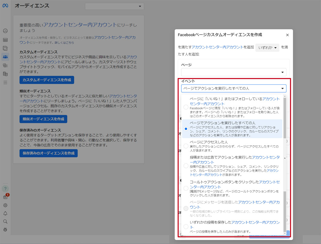 Facebookページカスタムオーディエンスの「イベント」から、利用したいものを選択しましょう。
