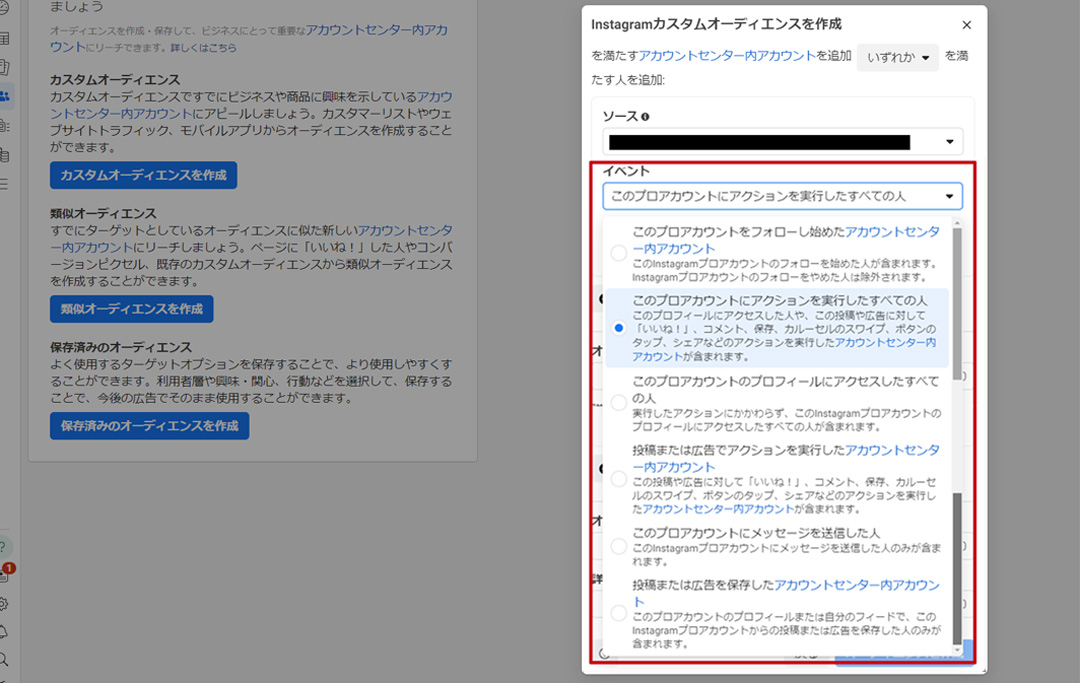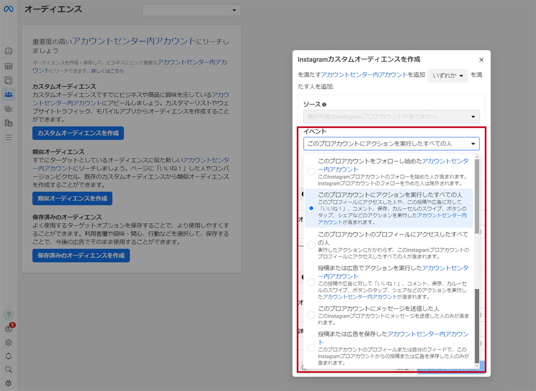 FacebookやInstagramで利用している機能・オーガニック投稿の内容、広告配信時に選択したメニューによって、カスタムオーディエンスに利用できるエンゲージメントは違います。