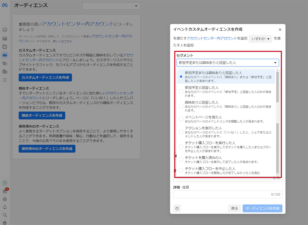 目標を考慮して、利用する予定のエンゲージメントカスタムオーディエンスの推定リーチ数が、必要最低限のコンバージョン数を獲得できる値に達しているかどうかを確認しておいてください。