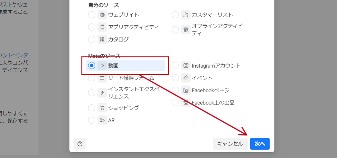 FacebookやInstagramのオーガニック動画・動画を一定条件で再生したユーザーに基づくカスタムオーディエンスです。