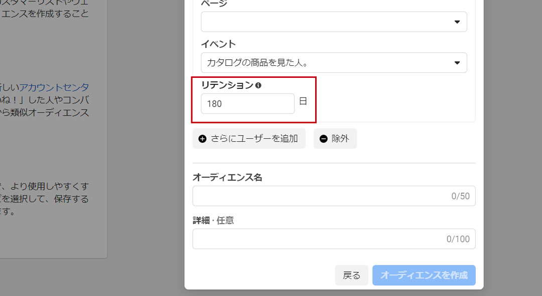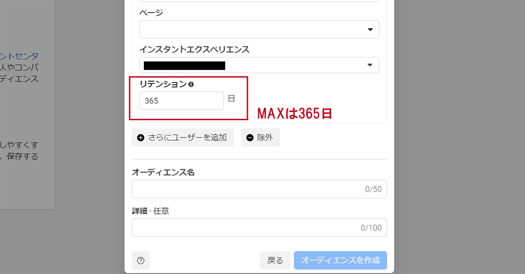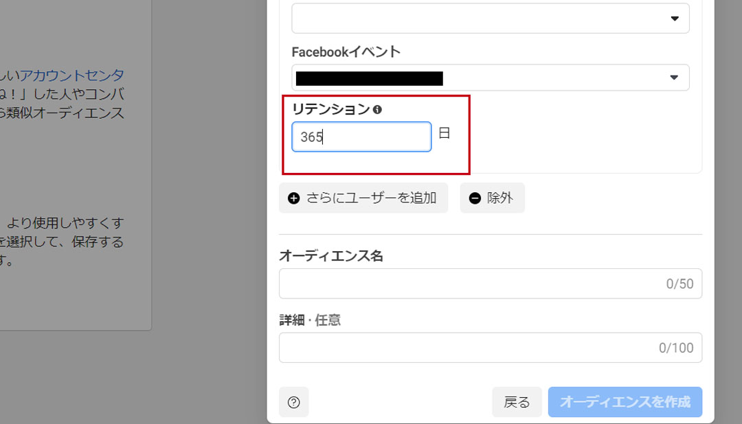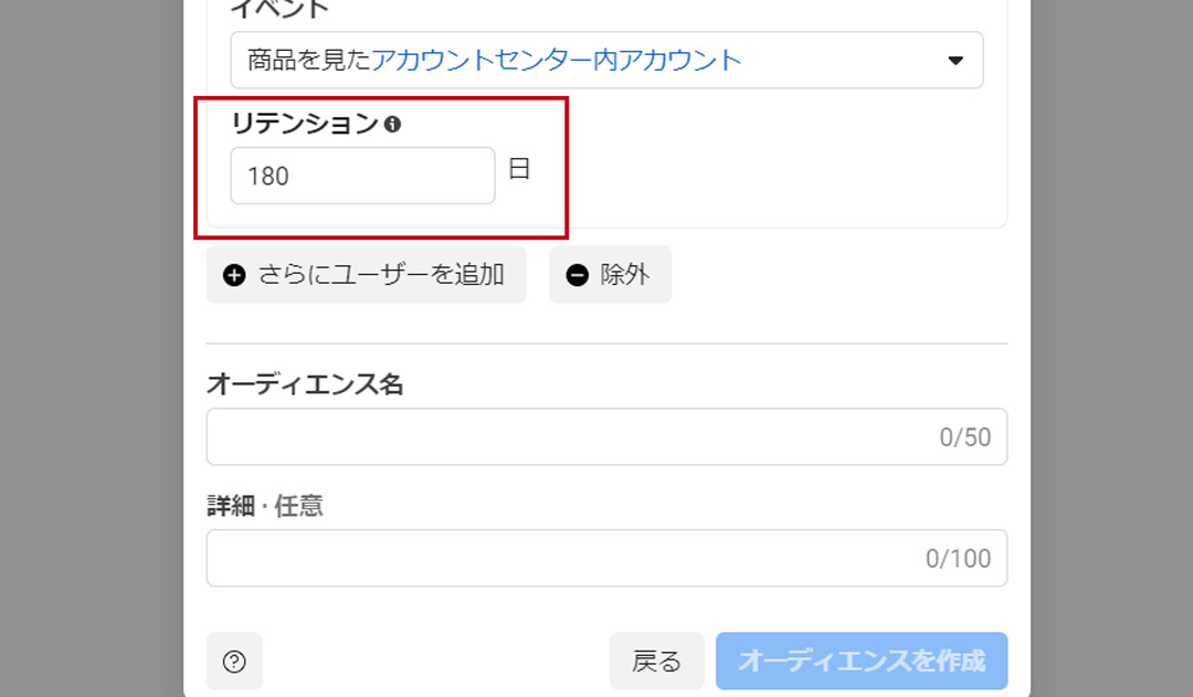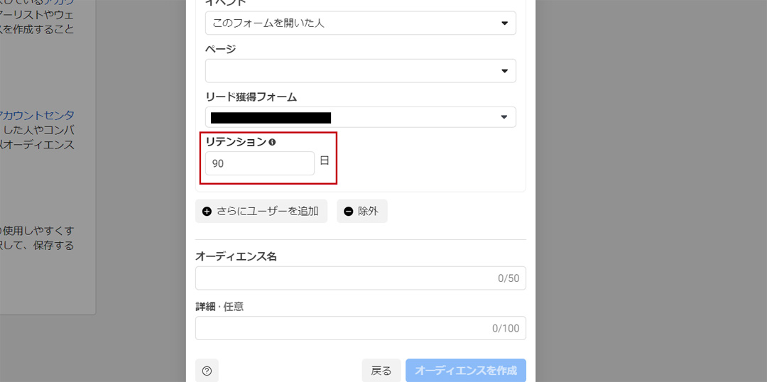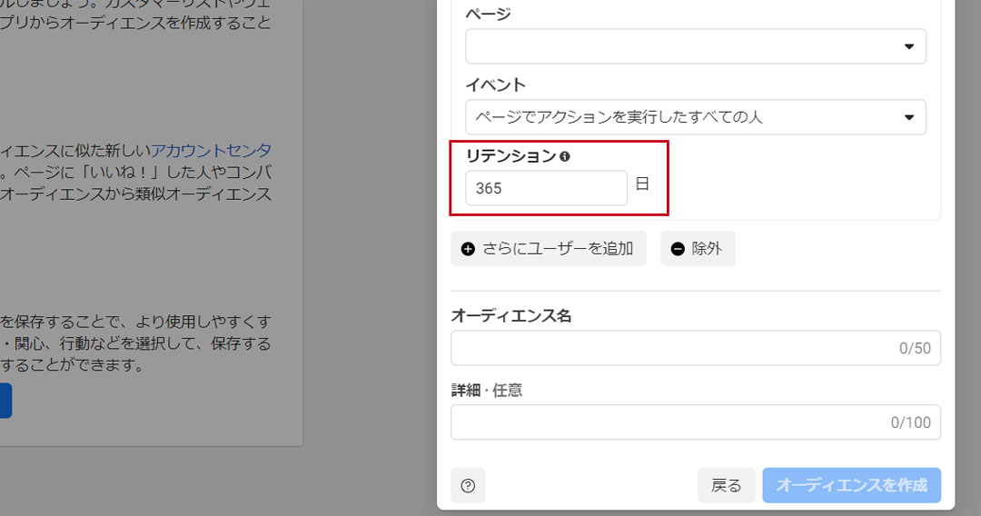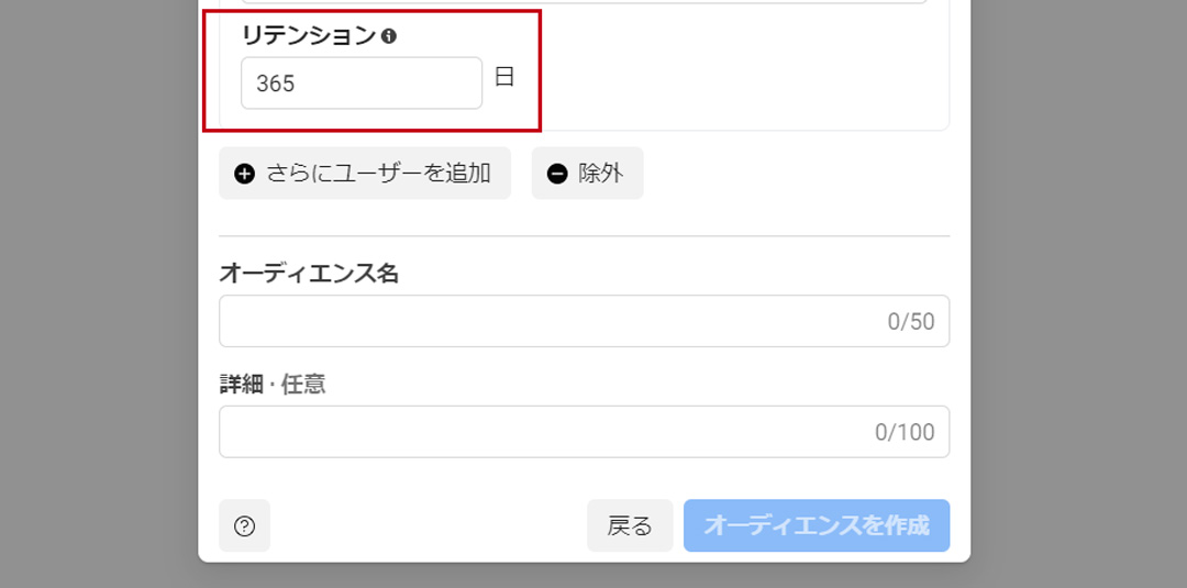 リテンションを入力し、オーディエンス名を入力しましょう。
