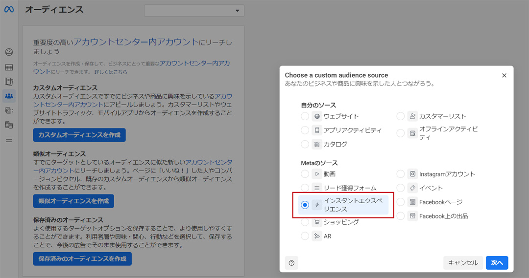 エンゲージの選択画面から、インスタントエクスペリエンスを選択して【次へ】をクリックしましょう。