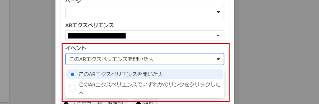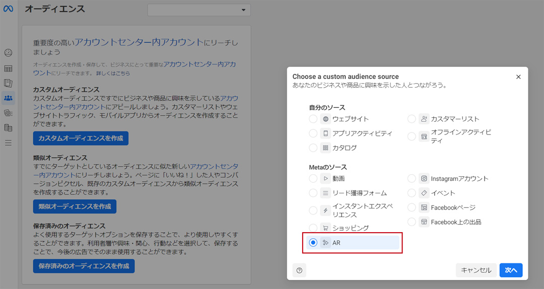 ARエクスペリエンスを利用しているアカウントなら、Facebook・Instagramで「ARエクスペリエンスを開いた」人の情報からオーディエンスが作成できます。